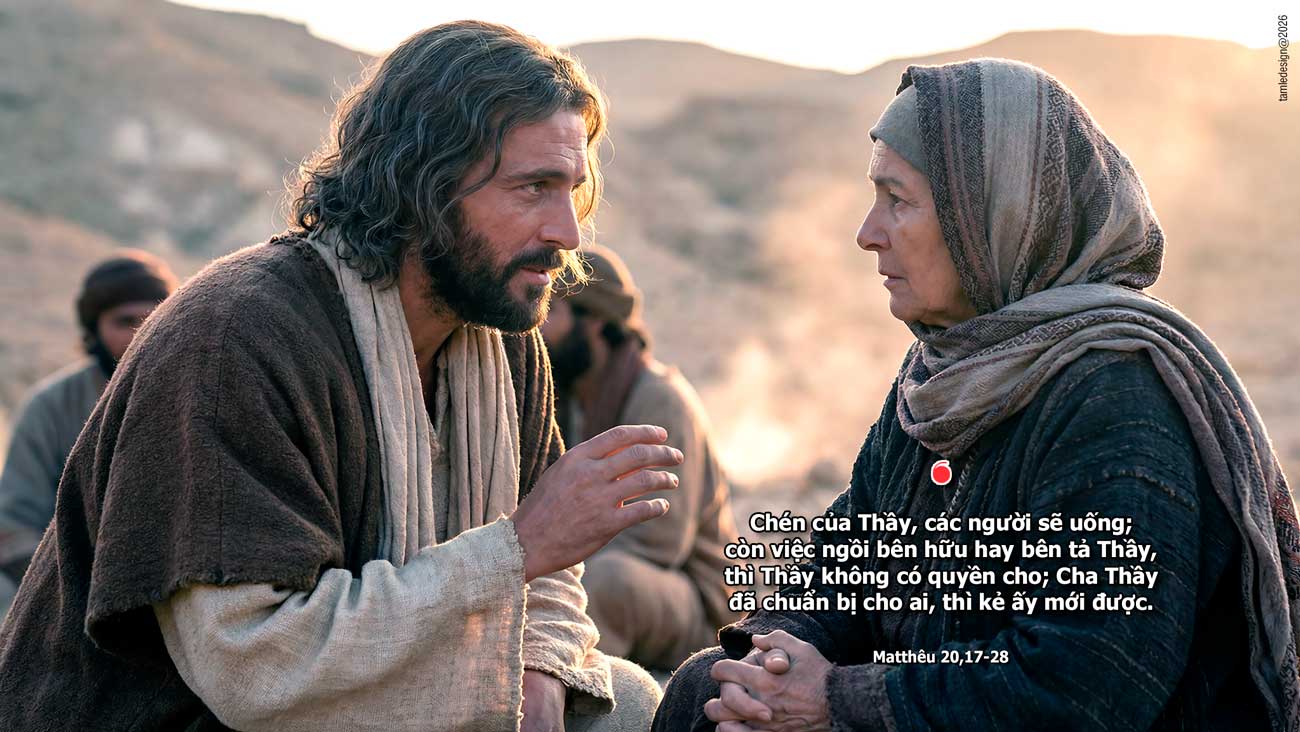 Lúc sắp lên Giê-ru-sa-lem, Đức Giê-su đưa Nhóm Mười Hai đi riêng với mình, và dọc đường, Người nói với các ông: “Này chúng ta lên Giê-ru-sa-lem, và Con Người sẽ bị nộp cho các thượng tế và kinh sư. Họ sẽ kết án tử hình Người, sẽ nộp Người cho dân ngoại nhạo báng, đánh đòn và đóng đinh vào Thập giá và, ngày thứ ba, Người sẽ chỗi dậy”. Bấy giờ bà mẹ của các con ông Dê-bê-đê đến gặp Đức Giê-su, có các con bà đi theo; bà bái lạy và kêu xin Người một điều. Người hỏi bà: “Bà muốn gì?” Bà thưa: “Xin Thầy truyền cho hai con tôi đây, một người ngồi bên hữu, một người bên tả Thầy trong Nước Thầy”. Đức Giê-su bảo: “Các người không biết các người xin gì! Các người có uống nổi chén Thầy sắp uống không?” Họ đáp: “Thưa uống nổi”. Đức Giê-su bảo: “Chén của Thầy, các người sẽ uống; còn việc ngồi bên hữu hay bên tả Thầy, thì Thầy không có quyền cho; Cha Thầy đã chuẩn bị cho ai, thì kẻ ấy mới được”. Nghe vậy, mười môn đệ kia tức tối với hai anh em đó. Nhưng Đức Giê-su gọi các ông lại và nói: “Anh em biết: thủ lãnh các dân thì lấy quyền mà thống trị dân, những người làm lớn thì dùng uy mà cai quản dân. Giữa anh em thì không được như vậy: Ai muốn làm lớn giữa anh em, thì phải làm người phục vụ anh em. Và ai muốn làm đầu anh em thì phải làm đầy tớ anh em. Cũng như Con Người đến không phải để được người ta phục vụ, nhưng là để phục vụ và hiến dâng mạng sống làm giá chuộc muôn người”. Đó là lời Chúa.
