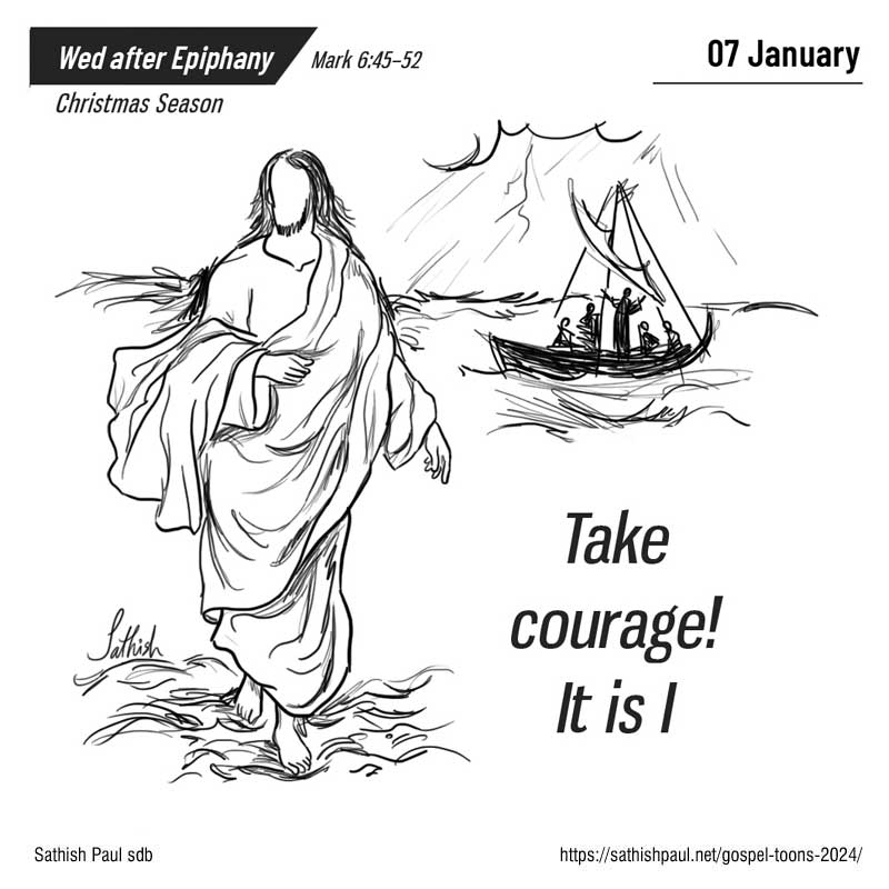 Sau khi cho năm ngàn người được ăn no nê, lập tức, Đức Giê-su bắt các môn đệ xuống thuyền qua bờ bên kia trước, về phía thành Bét-xai-đa, trong lúc Người giải tán đám đông. Sau khi cho họ đi, Người lên núi cầu nguyện. Chiều đến, chiếc thuyền đang ở giữa biển hồ, chỉ còn một mình Người ở trên đất. Người thấy các ông phải vất vả chèo chống vì gió ngược, nên vào khoảng canh tư đêm ấy, Người đi trên mặt biển mà đến với các ông và Người định vượt các ông. Nhưng khi các ông thấy Người đi trên mặt biển, lại tưởng là ma, thì la lên. Quả thế, tất cả các ông đều nhìn thấy Người và đều hoảng hốt. Lập tức, Người bảo các ông: “Cứ yên tâm, chính Thầy đây, đừng sợ!” Người lên thuyền với các ông, và gió lặng. Các ông cảm thấy bàng hoàng sửng sốt, vì các ông đã không hiểu ý nghĩa phép lạ bánh hoá nhiều: lòng trí các ông còn chai đá! Đó là lời Chúa.
