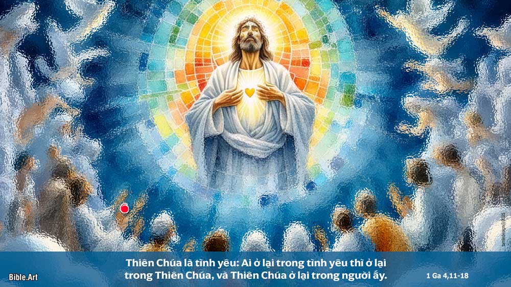 Anh em thân mến, nếu Thiên Chúa đã yêu thương chúng ta, chúng ta cũng phải yêu thương nhau. Thiên Chúa chưa ai được chiêm ngưỡng bao giờ. Nếu chúng ta yêu thương nhau, thì Thiên Chúa ở lại trong chúng ta, và tình yêu của Người nơi chúng ta mới nên hoàn hảo. Căn cứ vào điều này, chúng ta biết được rằng chúng ta ở lại trong Người và Người ở lại trong chúng ta: đó là Người đã ban Thần Khí của Người cho chúng ta. Phần chúng tôi, chúng tôi đã chiêm ngưỡng và làm chứng rằng: Chúa Cha đã sai Con của Người đến làm Đấng cứu độ thế gian. Hễ ai tuyên xưng Đức Giê-su là Con Thiên Chúa, thì Thiên Chúa ở lại trong người ấy và người ấy ở lại trong Thiên Chúa. Còn chúng ta, chúng ta đã biết tình yêu của Thiên Chúa nơi chúng ta, và đã tin vào tình yêu đó. Thiên Chúa là tình yêu: ai ở lại trong tình yêu thì ở lại trong Thiên Chúa, và Thiên Chúa ở lại trong người ấy. Căn cứ vào điều này mà tình yêu đã nên hoàn hảo với chúng ta: đó là chúng ta được mạnh dạn trong ngày phán xét, vì Đức Giê-su thế nào thì chúng ta cũng như vậy ở thế gian này. Tình yêu không biết đến sợ hãi; trái lại, tình yêu hoàn hảo loại trừ sợ hãi, vì sợ hãi gắn liền với hình phạt và ai sợ hãi thì không đạt tới tình yêu hoàn hảo. Đó là lời Chúa.