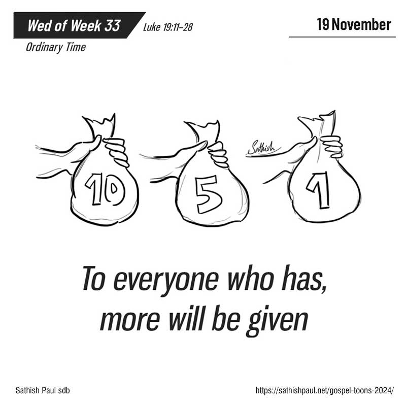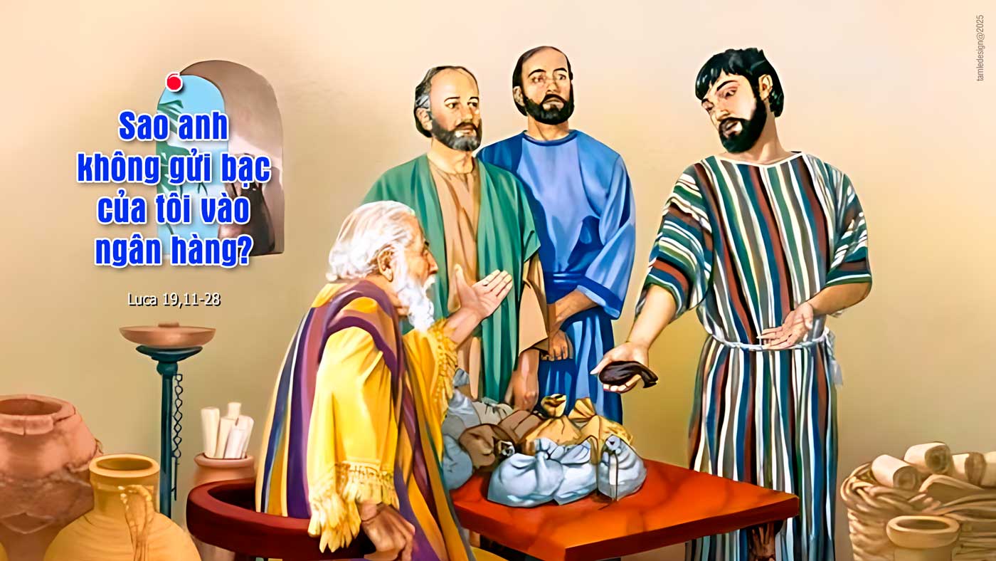 Khi ấy, dân chúng đang nghe Đức Giê-su, thì Người kể thêm một dụ ngôn, vì Người đang ở gần Giê-ru-sa-lem và vì họ tưởng là Triều Đại Thiên Chúa sắp xuất hiện đến nơi rồi. Vậy Người nói: “Có một người quý tộc kia trẩy đi phương xa lãnh nhận vương quyền, rồi trở về. Ông gọi mười người trong các tôi tớ của ông đến, phát cho họ mười nén bạc và nói với họ: “Hãy lo làm ăn sinh lợi cho tới khi tôi đến.” Nhưng đồng bào ông ghét ông, nên họ cử một phái đoàn đến sau ông để nói rằng: “Chúng tôi không muốn ông này làm vua chúng tôi. “Sau khi lãnh nhận vương quyền, ông trở về. Bấy giờ ông truyền gọi những đầy tớ ông đã giao bạc cho, để xem mỗi người làm ăn sinh lợi được bao nhiêu. Người thứ nhất đến trình: “Thưa ngài, nén bạc của ngài đã sinh lợi được mười nén. Ông bảo người ấy: “Khá lắm, hỡi đầy tớ tài giỏi! Vì anh đã trung thành trong việc rất nhỏ, thì hãy cầm quyền cai trị mười thành. Người thứ hai đến trình: “Thưa ngài, nén bạc của ngài đã làm lợi được năm nén. Ông cũng bảo người ấy: “Anh cũng vậy, anh hãy cai trị năm thành. Rồi người thứ ba đến trình: “Thưa ngài, nén bạc của ngài đây, tôi đã bọc khăn giữ kỹ. Tôi sợ ngài, vì ngài là người khắc nghiệt, đòi cái không gửi, gặt cái không gieo. Ông nói: “Hỡi đầy tớ tồi tệ! Tôi cứ lời miệng anh mà xử anh. Anh đã biết tôi là người khắc nghiệt, đòi cái không gửi, gặt cái không gieo. Thế sao anh không gửi bạc của tôi vào ngân hàng? Có vậy, khi tôi đến, tôi mới rút ra được cả vốn lẫn lời chứ! Rồi ông bảo những người đứng đó: “Lấy lại nén bạc nó giữ mà đưa cho người đã có mười nén. Họ thưa ông: “Thưa ngài, anh ấy có mười nén rồi!” Tôi nói cho các anh hay: phàm ai đã có, thì sẽ được cho thêm; còn ai không có, thì ngay cái nó đang có cũng sẽ bị lấy đi. “Còn bọn thù địch của tôi kia, những người không muốn tôi làm vua cai trị chúng, thì hãy dẫn chúng lại đây và giết chết trước mặt tôi.” Nói những lời ấy xong, Đức Giê-su đi đầu, tiến lên Giê-ru-sa-lem. Đó là lời Chúa.