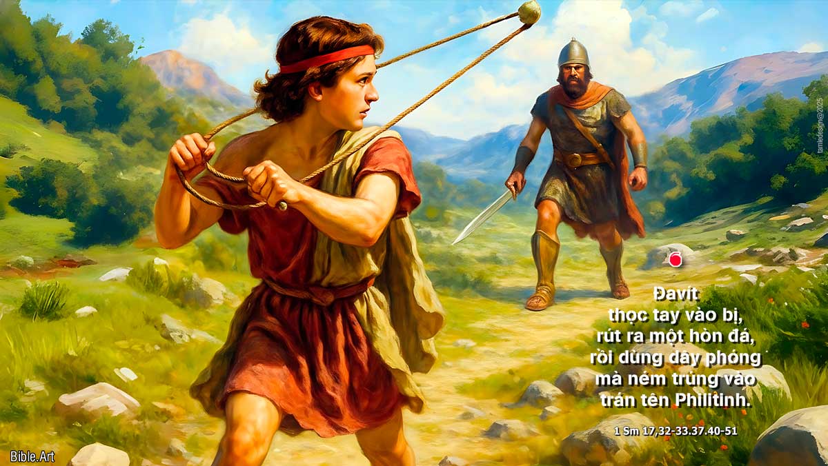 Ngày ấy, Đa-vít được dẫn đến gặp vua Sa-un và nói với vua Sa-un rằng: “Đừng ai ngã lòng vì tên Phi-li-tinh Go-li-át. Tôi tớ ngài đây sẽ đi chiến đấu với nó.” Vua Sa-un nói với Đa-vít: “Con không thể đến với tên Phi-li-tinh ấy để chiến đấu với nó, vì con chỉ là một đứa trẻ, còn nó, từ khi còn trẻ, đã là một chiến binh.” Đa-vít nói: “Đức Chúa là Đấng đã cứu con khỏi vuốt sư tử và vuốt gấu, chính Người sẽ cứu con khỏi tay tên Phi-li-tinh này.” Vua Sa-un nói với Đa-vít: “Thế thì con hãy đi, xin Đức Chúa ở với con!” Cậu cầm gậy trong tay, chọn lấy năm hòn đá cuội dưới suối, bỏ vào túi chăn chiên, vào bị của cậu, rồi tay cầm dây phóng đá, cậu tiến về phía tên Phi-li-tinh. Tên Phi-li-tinh từ từ tiến lại gần Đa-vít, đi trước mặt nó là người mang thuẫn. Tên Phi-li-tinh nhìn, và khi thấy Đa-vít, nó khinh dể cậu, vì cậu còn trẻ, có mái tóc hung và đẹp trai. Tên Phi-li-tinh nói với Đa-vít: “Tao là chó hay sao mà mầy cầm gậy đến với tao?” Và tên Phi-li-tinh lấy tên các thần của mình mà nguyền rủa Đa-vít. Tên Phi-li-tinh nói với Đa-vít: “Đến đây với tao, tao sẽ đem thịt mày làm mồi cho chim trời và dã thú.” Đa-vít bảo tên Phi-li-tinh: “Mày mang gươm, mang giáo, cầm lao mà đến với tao. Còn tao, tao đến với mày nhân danh Đức Chúa các đạo binh là Thiên Chúa các hàng ngũ Ít-ra-en mà mày thách thức. Ngay hôm nay Đức Chúa sẽ nộp mày vào tay tao, tao sẽ hạ mày và làm cho đầu mày lìa khỏi thân. Ngay hôm nay tao sẽ đem xác chết của quân đội Phi-li-tinh làm mồi cho chim trời và dã thú. Toàn cõi đất sẽ biết rằng có một Thiên Chúa che chở Ít-ra-en, và toàn thể đại hội này sẽ biết rằng không phải nhờ gươm, nhờ giáo mà Đức Chúa ban chiến thắng, vì chiến đấu là việc của Đức Chúa, và Người sẽ trao chúng mày vào tay chúng tao!” Khi tên Phi-li-tinh bắt đầu xông lên và đến gần để đương đầu với Đa-vít, thì từ trận tuyến Đa-vít vội vàng chạy ra đương đầu với tên Phi-li-tinh. Đa-vít thọc tay vào bị, rút từ đó ra một hòn đá, rồi dùng dây phóng mà ném trúng vào trán tên Phi-li-tinh. Hòn đá cắm sâu vào trán, khiến nó ngã sấp mặt xuống đất. Thế là Đa-vít thắng tên Phi-li-tinh nhờ dây phóng và hòn đá. Cậu hạ tên Phi-li-tinh và giết nó. Nhưng trong tay Đa-vít không có gươm. Đa-vít chạy lại, đứng trên xác tên Phi-li-tinh, lấy gươm của nó, rút khỏi bao, kết liễu đời nó và dùng gươm chặt đầu nó. Người Phi-li-tinh thấy người hùng của mình đã chết thì chạy trốn. Ðó là lời Chúa.