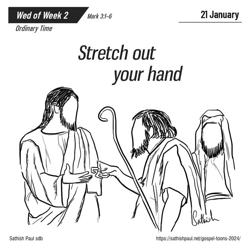 Et s’adressant aux autres : « Est-il permis, le jour du sabbat, de faire le bien ou de faire le mal ? de sauver une vie ou de tuer ? » Mais eux se taisaient. Alors, promenant sur eux un regard de colère, navré de l’endurcissement de leurs cœurs, il dit à l’homme : « Étends la main. » Il l’étendit, et sa main redevint normale. (Mc 3, 1-6)