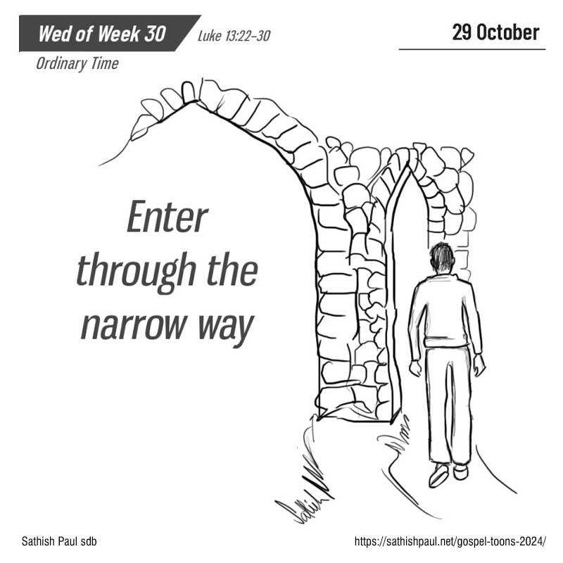En ce temps-là, tandis qu’il faisait route vers Jérusalem, Jésus traversait villes et villages en enseignant. Quelqu’un lui demanda : « Seigneur, n’y a-t-il que peu de gens qui soient sauvés ? » Jésus leur dit : “Efforcez-vous d’entrer par la porte étroite, car, je vous le déclare, beaucoup chercheront à entrer et n’y parviendront pas.” (Lc 13, 22-30)