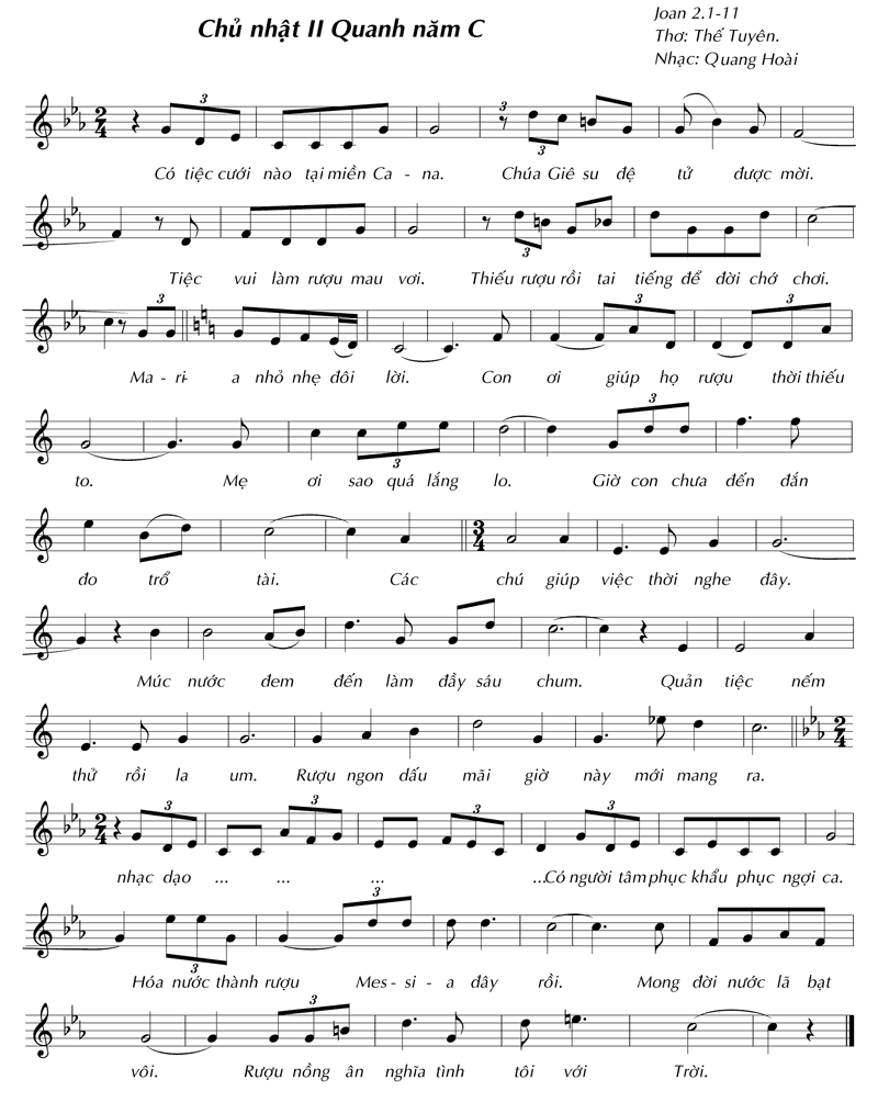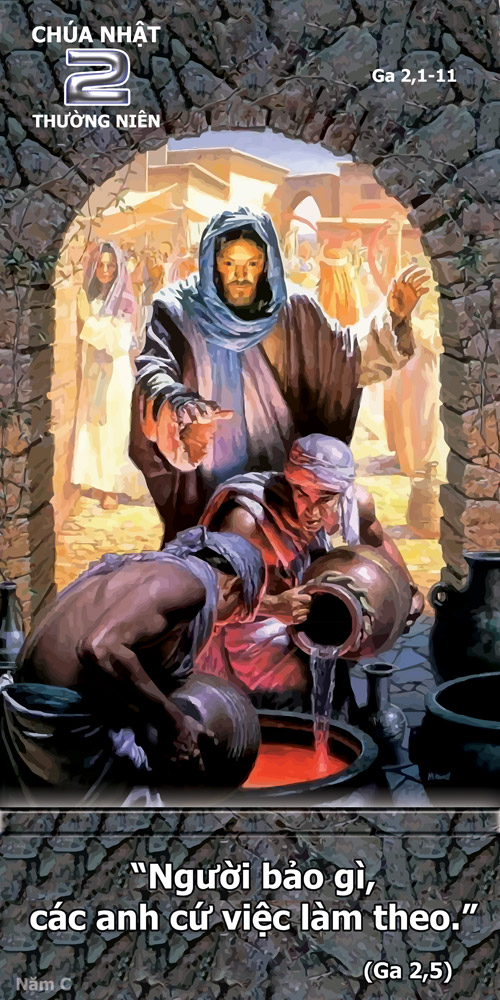 Ở đó có đặt sáu chum đá dùng vào việc thanh tẩy theo thói tục người Do-thái, mỗi chum chứa được khoảng tám mươi hoặc một trăm hai mươi lít nước. Đức Giê-su bảo họ: “Các anh đổ đầy nước vào chum đi!” Và họ đổ đầy tới miệng. Rồi Người nói với họ: “Bây giờ các anh múc và đem cho ông quản tiệc.” Họ liền đem cho ông. Khi người quản tiệc nếm thử nước đã hoá thành rượu (mà không biết rượu từ đâu ra, còn gia nhân đã múc nước thì biết), ông mới gọi tân lang lại và nói: “Ai cũng thết rượu ngon trước, và khi khách đã ngà ngà mới đãi rượu xoàng hơn. Còn anh, anh lại giữ rượu ngon mãi cho đến bây giờ.” Đức Giê-su đã làm dấu lạ đầu tiên này tại Ca-na miền Ga-li-lê và bày tỏ vinh quang của Người. Các môn đệ đã tin vào Người. Đó là Lời Chúa.