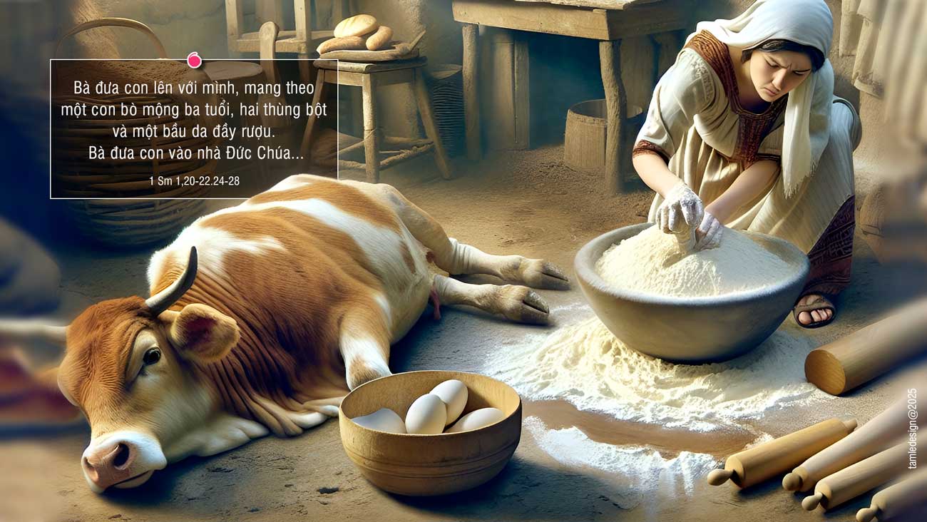 Ngày qua tháng lại, bà An-na thụ thai, sinh con trai và đặt tên cho nó là Sa-mu-en, vì bà nói : « Tôi đã xin Đức Chúa, và Người ban nó cho tôi. » Người chồng là En-ca-na lên với cả gia đình để dâng hy lễ thường niên cho Đức Chúa và để giữ trọn lời khấn hứa của mình. Bà An-na không lên, vì bà nói với chồng : « Đợi cho đến khi đứa trẻ cai sữa đã. Khi đó em sẽ đưa nó đi, nó sẽ ra mắt Đức Chúa và sẽ ở lại đó mãi mãi. » … Sau khi cai sữa cho con, bà đưa nó lên với mình, mang theo một con bò mộng ba tuổi, hai thùng bột và một bầu da đầy rượu. Bà đưa con vào nhà Đức Chúa tại Si-lô; đứa trẻ còn nhỏ lắm. Họ sát tế con bò và đưa đứa trẻ đến với ông Ê-li. Bà nói : « Thưa ngài, xin thứ lỗi, tôi xin lấy mạng sống ngài mà thề : tôi là người đàn bà đã đứng bên ngài, tại đây, để cầu nguyện với Đức Chúa. Tôi đã cầu nguyện để được đứa trẻ này, và Đức Chúa đã ban cho tôi điều tôi đã xin Người. Đến lượt tôi, tôi xin nhượng nó lại cho Đức Chúa. Mọi ngày đời nó, nó sẽ được nhượng cho Đức Chúa. » Và ở đó, họ thờ lạy Đức Chúa. Đó là lời Chúa.