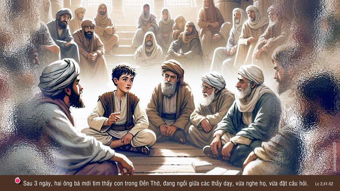 Hằng năm, cha mẹ Đức Giê-su trẩy hội đền Giê-ru-sa-lem mừng lễ Vượt Qua. Khi Người được mười hai tuổi, cả gia đình cùng lên đền, theo tập tục ngày lễ. Xong kỳ lễ, hai ông bà trở về, còn cậu bé Giê-su thì ở lại Giê-ru-sa-lem, mà cha mẹ chẳng hay biết. Ông bà cứ tưởng là cậu về chung với đoàn lữ hành, nên sau một ngày đường, mới đi tìm kiếm giữa đám bà con và người quen thuộc. Không thấy con đâu, hai ông bà trở lại Giê-ru-sa-lem mà tìm. Sau ba ngày, hai ông bà mới tìm thấy con trong Đền Thờ, đang ngồi giữa các thầy dạy, vừa nghe họ, vừa đặt câu hỏi. Ai nghe cậu nói cũng ngạc nhiên về trí thông minh và những lời đáp của cậu. Khi thấy con, hai ông bà sửng sốt, và mẹ Người nói với Người: “Con ơi, sao con lại xử với cha mẹ như vậy? Con thấy không, cha con và mẹ đây đã phải cực lòng tìm con!” Người đáp: “Sao cha mẹ lại tìm con? Cha mẹ không biết là con có bổn phận ở nhà của Cha con sao?” Nhưng ông bà không hiểu lời Người vừa nói. Sau đó, Người đi xuống cùng với cha mẹ, trở về Na-da-rét và hằng vâng phục các ngài. Riêng mẹ Người thì hằng ghi nhớ tất cả những điều ấy trong lòng. Còn Đức Giê-su ngày càng thêm khôn ngoan, thêm cao lớn và thêm ân nghĩa trước mặt Thiên Chúa và người ta. Đó là lời Chúa.