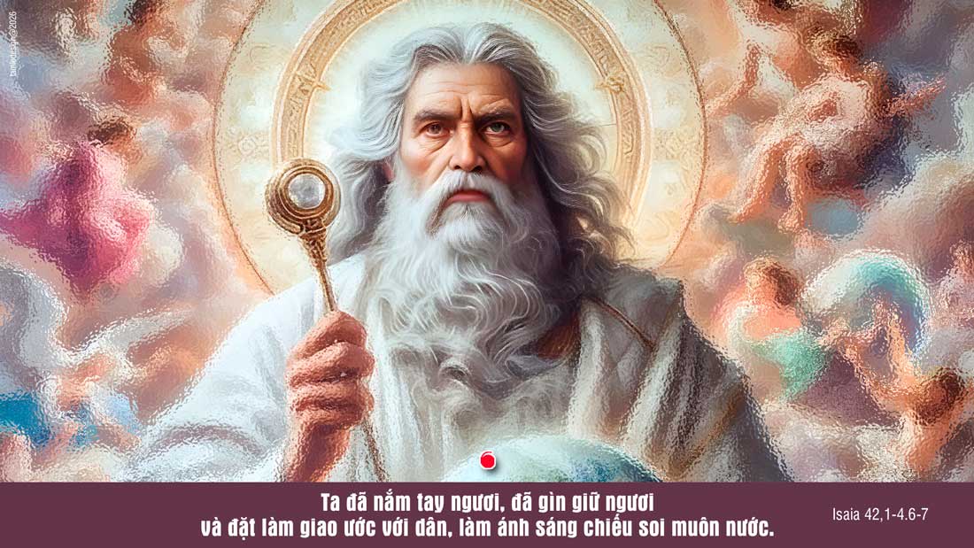 Đức Chúa phán: Đây là người tôi tớ Ta nâng đỡ, là người Ta tuyển chọn và hết lòng quý mến, Ta cho thần khí Ta ngự trên người; người sẽ làm sáng tỏ công lý trước muôn dân. Người sẽ không kêu to, không nói lớn, không để ai nghe tiếng giữa phố phường. Cây lau bị giập, người không đành bẻ gẫy, tim đèn leo lét, cũng chẳng nỡ tắt đi. Người sẽ trung thành làm sáng tỏ công lý. Người không yếu hèn, không chịu phục, cho đến khi thiết lập công lý trên địa cầu. Dân các hải đảo xa xăm đều mong được người chỉ bảo. Người phán thế này: “Ta là Đức Chúa, Ta đã gọi ngươi, vì muốn làm sáng tỏ đức công chính của Ta. Ta đã nắm tay ngươi, đã gìn giữ ngươi và đặt làm giao ước với dân, làm ánh sáng chiếu soi muôn nước, để mở mắt cho những ai mù loà, đưa ra khỏi tù những người bị giam giữ, dẫn ra khỏi ngục những kẻ ngồi trong chốn tối tăm.” Đó là lời Chúa.
