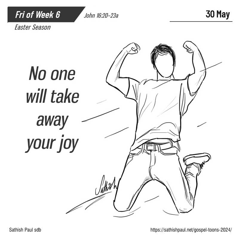 Khi ấy, Đức Giê-su nói với các môn đệ rằng: “Thật, Thầy bảo thật anh em: anh em sẽ khóc lóc và than van, còn thế gian sẽ vui mừng. Anh em sẽ lo buồn, nhưng nỗi buồn của anh em sẽ trở thành niềm vui. Khi sinh con, người đàn bà lo buồn vì đến giờ của mình; nhưng sinh con rồi, thì không còn nhớ đến cơn gian nan nữa, bởi được chan chứa niềm vui vì một con người đã sinh ra trong thế gian. Anh em cũng vậy, bây giờ anh em lo buồn, nhưng Thầy sẽ gặp lại anh em, lòng anh em sẽ vui mừng; và niềm vui của anh em, không ai lấy mất được. Ngày ấy, anh em không còn phải hỏi Thầy gì nữa.” Đó là lời Chúa.