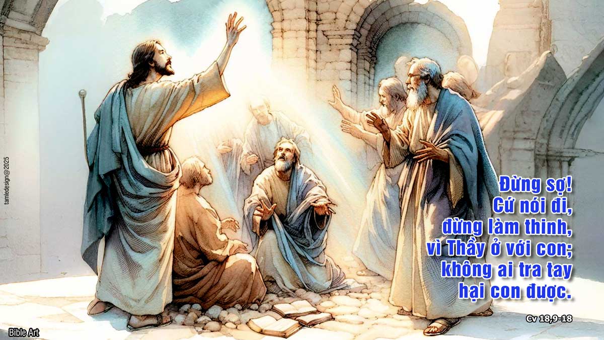 Khi ông Phao-lô đang ở Cô-rin-tô, thì vào một đêm, Chúa bảo ông trong một thị kiến: “Đừng sợ! Cứ nói đi, đừng làm thinh, vì Thầy ở với con; không ai tra tay hại con được, vì Thầy có một dân đông đảo trong thành này.” Ông Phao-lô ở lại đó một năm rưỡi, dạy cho họ lời Thiên Chúa. Thời ông Ga-li-on làm thống đốc tỉnh A-khai-a, người Do-thái nhất tề nổi dậy chống ông Phao-lô; họ đưa ông ra toà và nói: “Tên này xúi giục người ta tôn thờ Thiên Chúa trái với Lề Luật.” Ông Phao-lô toan mở miệng, thì ông Ga-li-on đã nói với người Do-thái: “Hỡi người Do-thái, giả như có gì là trái Luật hay phạm pháp, thì lẽ đương nhiên là tôi sẽ chịu khó nghe các ông. Nhưng đây lại là những chuyện tranh luận về giáo thuyết, danh từ, luật lệ riêng của các ông, thì các ông hãy tự xét lấy. Phần tôi, tôi không muốn làm người xét xử những điều ấy.” Rồi ông đuổi họ ra khỏi toà án. Mọi người liền túm lấy ông Xốt-thê-nê, trưởng hội đường, mà đánh túi bụi ngay trước toà án. Nhưng ông Ga-li-on chẳng bận tâm gì về việc này. Ông Phao-lô còn ở lại Cô-rin-tô khá lâu, rồi từ giã các anh em và vượt biển sang miền Xy-ri-a, cùng với bà Pơ-rít-ki-la và ông A-qui-la. Trước đó, tại Ken-khơ-rê, ông xuống tóc, vì có lời khấn. Đó là lời Chúa.