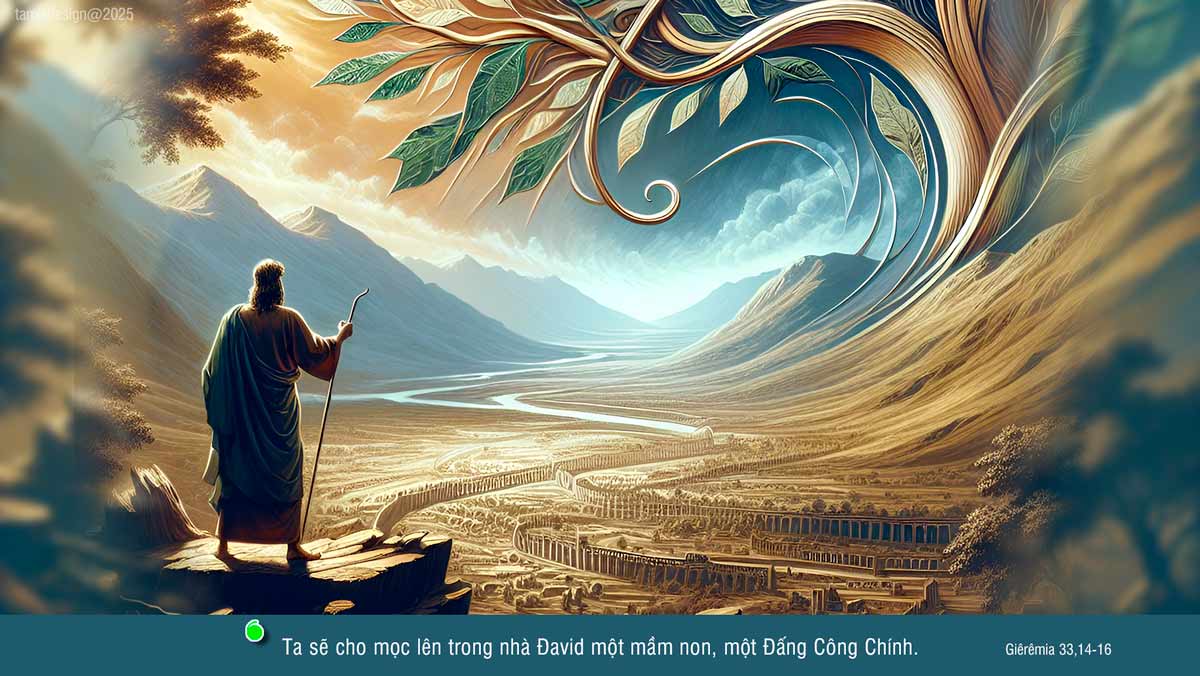 Này sẽ đến những ngày – sấm ngôn của Đức Chúa – Ta sẽ thực hiện điều tốt lành Ta đã phán về nhà Ít-ra-en và về Giu-đa. Trong những ngày ấy, vào thời đó, Ta sẽ cho mọc lên một mầm non, một Đấng Công Chính để nối nghiệp Đa-vít; Người sẽ trị nước theo lễ công bình chính trực. Trong những ngày ấy, Giu-đa sẽ được cứu thoát, Giê-ru-sa-lem sẽ an cư lạc nghiệp. Đây là tên người ta sẽ đặt cho thành: “Đức-Chúa-là-sự-công-chính-của-chúng-ta!” Đó là lời Chúa.