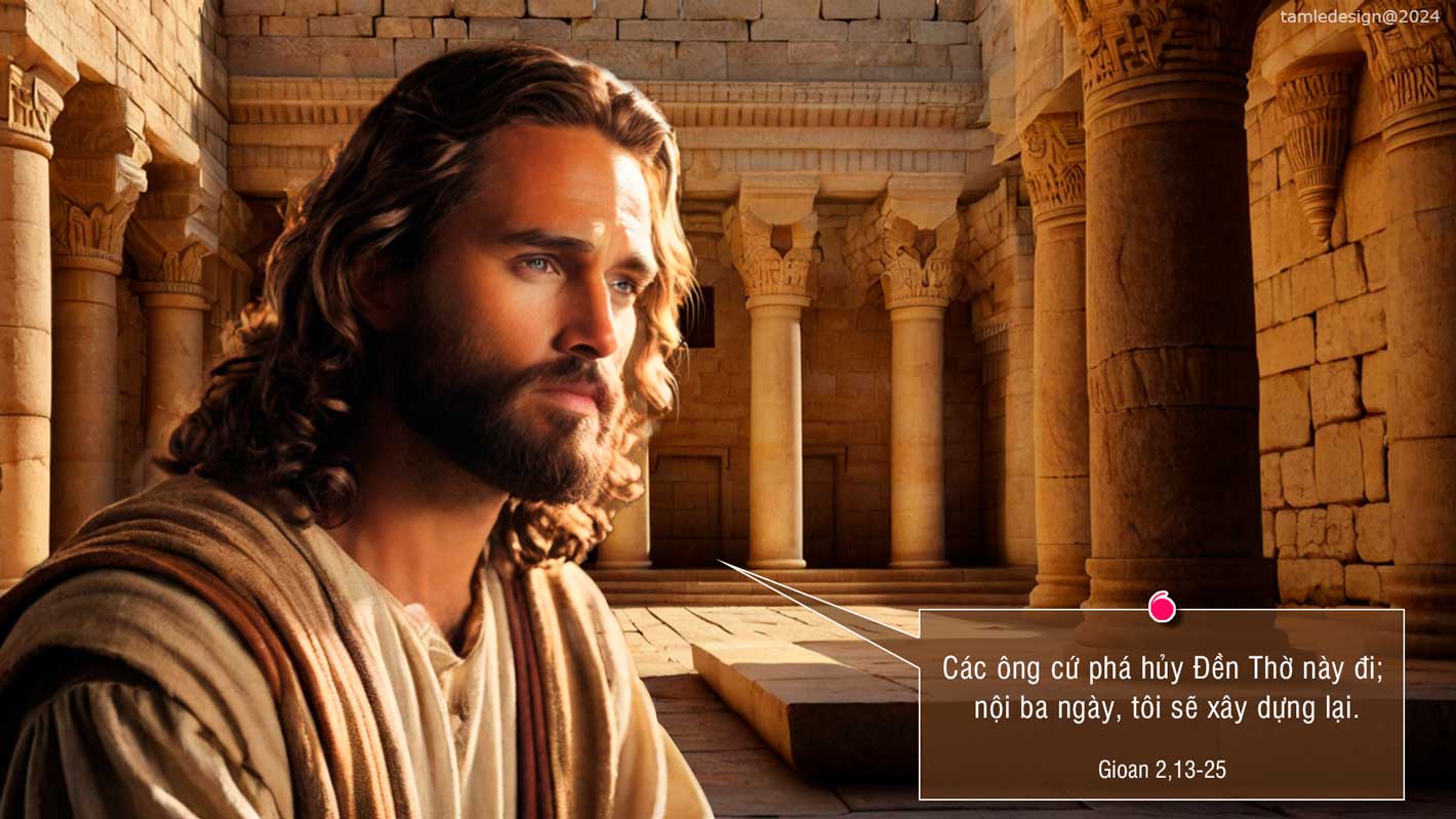 Gần đến lễ Vượt Qua của người Do-thái, Đức Giê-su lên thành Giê-ru-sa-lem. Người thấy trong Đền Thờ có những kẻ bán chiên, bò, bồ câu, và những người đang ngồi đổi tiền. Người liền lấy dây làm roi mà xua đuổi tất cả bọn họ cùng với chiên bò ra khỏi Đền Thờ; còn tiền của những người đổi bạc, Người đổ tung ra, và lật nhào bàn ghế của họ. Người nói với những kẻ bán bồ câu: “Đem tất cả những thứ này ra khỏi đây, đừng biến nhà Cha tôi thành nơi buôn bán.” Các môn đệ của Người nhớ lại lời đã chép trong Kinh Thánh: Vì nhiệt tâm lo việc nhà Chúa, mà tôi đây sẽ phải thiệt thân. Người Do-thái hỏi Đức Giê-su: “Ông lấy dấu lạ nào chứng tỏ cho chúng tôi thấy là ông có quyền làm như thế?” Đức Giê-su đáp: “Các ông cứ phá hủy Đền Thờ này đi; nội ba ngày, tôi sẽ xây dựng lại.” Người Do-thái nói: “Đền Thờ này phải mất bốn mươi sáu năm mới xây xong, thế mà nội trong ba ngày ông xây lại được sao?” Nhưng Đền Thờ Đức Giê-su muốn nói ở đây là chính thân thể Người. Vậy, khi Người từ cõi chết chỗi dậy, các môn đệ nhớ lại Người đã nói điều đó. Họ tin vào Kinh Thánh và lời Đức Giê-su đã nói. Trong lúc Đức Giê-su ở Giê-ru-sa-lem vào dịp lễ Vượt Qua, có nhiều kẻ tin vào danh Người bởi đã chứng kiến các dấu lạ Người làm. Nhưng chính Đức Giê-su không tin họ, vì Người biết họ hết thảy, và không cần ai làm chứng về con người. Quả thật, chính Người biết có gì trong lòng con người. Đó là lời Chúa.