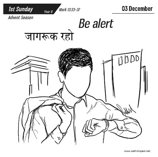 Hôm ấy, Đức Giê-su nói với các môn đệ rằng: “Anh em phải coi chừng, phải tỉnh thức, vì anh em không biết khi nào thời ấy đến. Cũng như người kia trẩy phương xa, để nhà lại, trao quyền cho các đầy tớ của mình, chỉ định cho mỗi người một việc, và ra lệnh cho người giữ cửa phải canh thức. Vậy anh em phải canh thức, vì anh em không biết khi nào chủ nhà đến: Lúc chập tối hay nửa đêm, lúc gà gáy hay tảng sáng. Anh em phải canh thức, kẻo lỡ ra ông chủ đến bất thần, bắt gặp anh em đang ngủ. Điều Thầy nói với anh em đây, Thầy cũng nói với hết thảy mọi người là: phải canh thức!” Đó là lời Chúa.