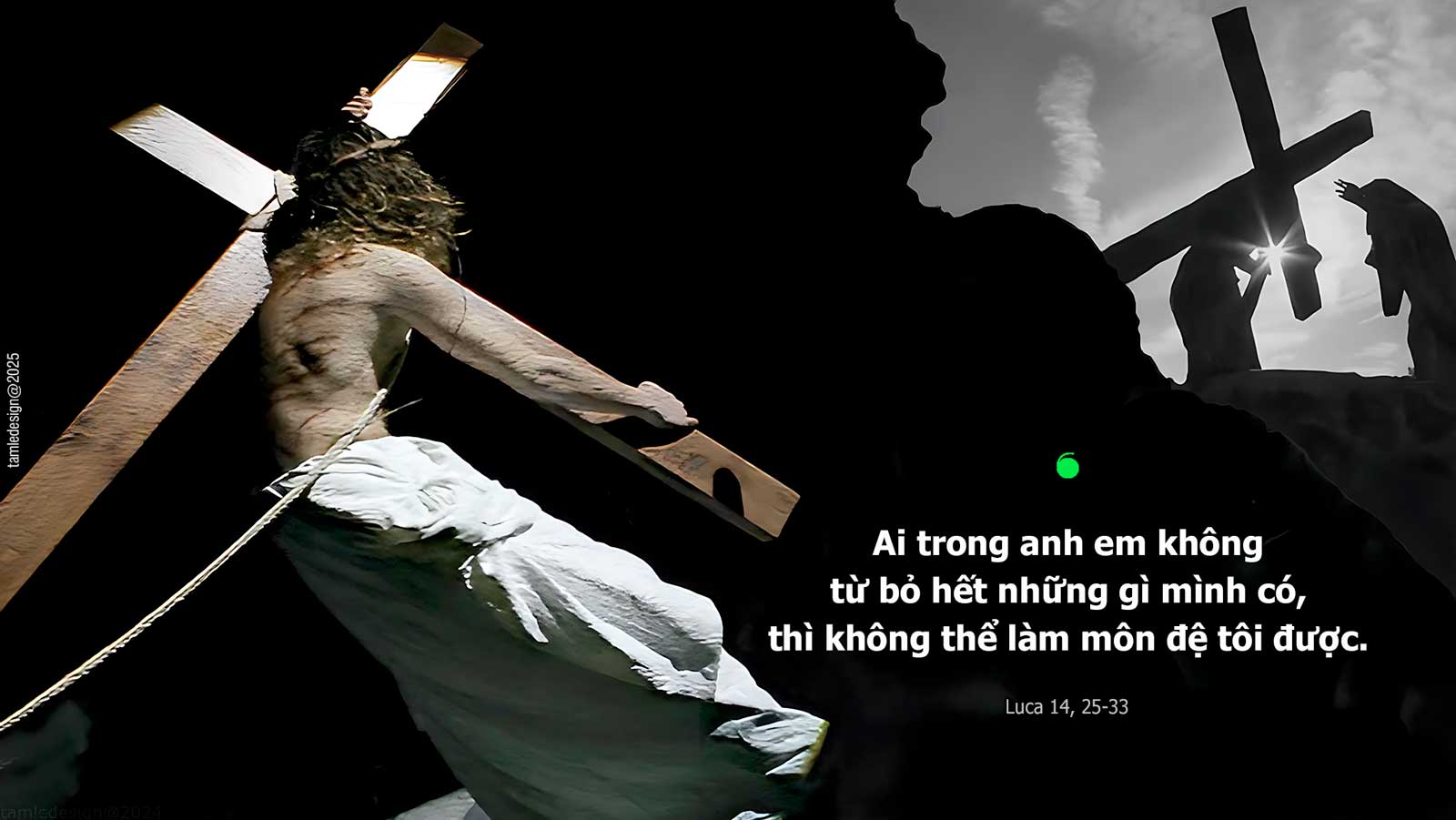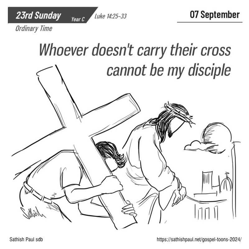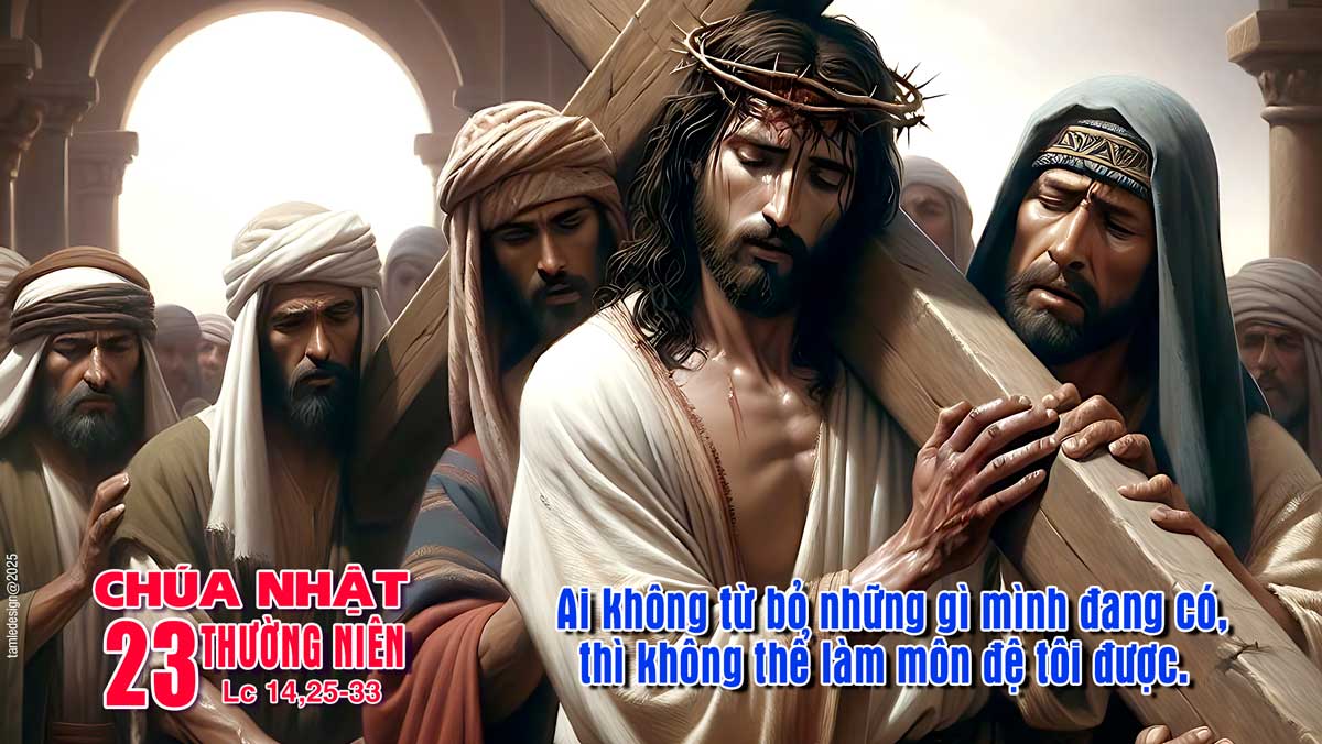 Khi ấy, có rất đông người cùng đi đường với Đức Giê-su. Người quay lại bảo họ: “Ai đến với tôi mà không dứt bỏ cha mẹ, vợ con, anh em, chị em, và cả mạng sống mình nữa, thì không thể làm môn đệ tôi được. Ai không vác thập giá mình mà đi theo tôi, thì không thể làm môn đệ tôi được. “Quả thế, ai trong anh em muốn xây một cây tháp, mà trước tiên lại không ngồi xuống tính toán phí tổn, xem mình có đủ để hoàn thành không? Kẻo lỡ ra, đặt móng rồi mà không có khả năng làm xong, thì mọi người thấy vậy sẽ lên tiếng chê cười mà bảo: ‘Anh ta đã khởi công xây, mà chẳng có sức làm cho xong việc.’ Hoặc có vua nào đi giao chiến với một vua khác, mà trước tiên lại không ngồi xuống bàn tính xem mình có thể đem một vạn quân ra, đương đầu với đối phương dẫn hai vạn quân tiến đánh mình chăn? Nếu không đủ sức, thì khi đối phương còn ở xa, ắt nhà vua đã phải sai sứ đi cầu hoà. Cũng vậy, ai trong anh em không từ bỏ hết những gì mình có, thì không thể làm môn đệ tôi được. Ðó là lời Chúa.