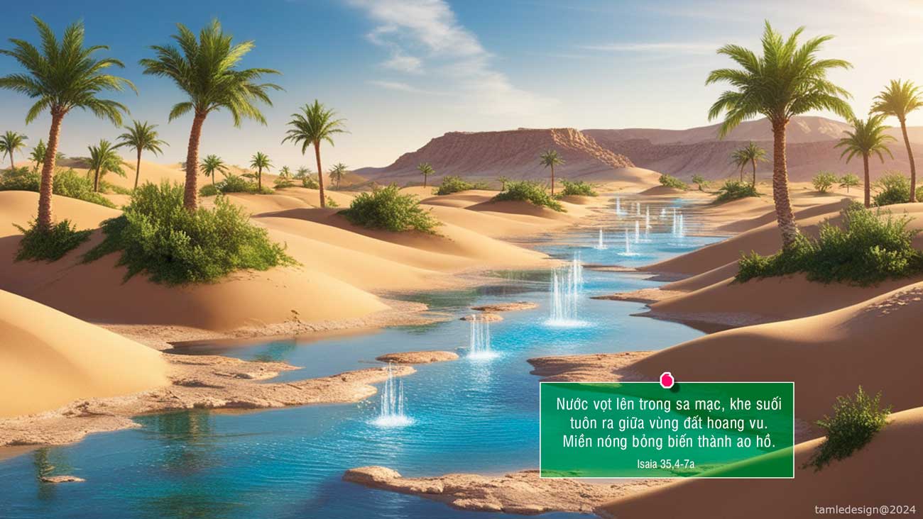 Hãy nói với những kẻ nhát gan: “Can đảm lên, đừng sợ! Thiên Chúa của anh em đây rồi; sắp tới ngày báo phục, ngày Thiên Chúa thưởng công, phạt tội. Chính Người sẽ đến cứu anh em.” Bấy giờ mắt người mù mở ra, tai người điếc nghe được. Bấy giờ kẻ què sẽ nhảy nhót như nai, miệng lưỡi người câm sẽ reo hò. Vì có nước vọt lên trong sa mạc, khe suối tuôn ra giữa vùng đất hoang vu. Miền nóng bỏng biến thành ao hồ, đất khô cằn có mạch nước trào ra. Đó là lời Chúa.