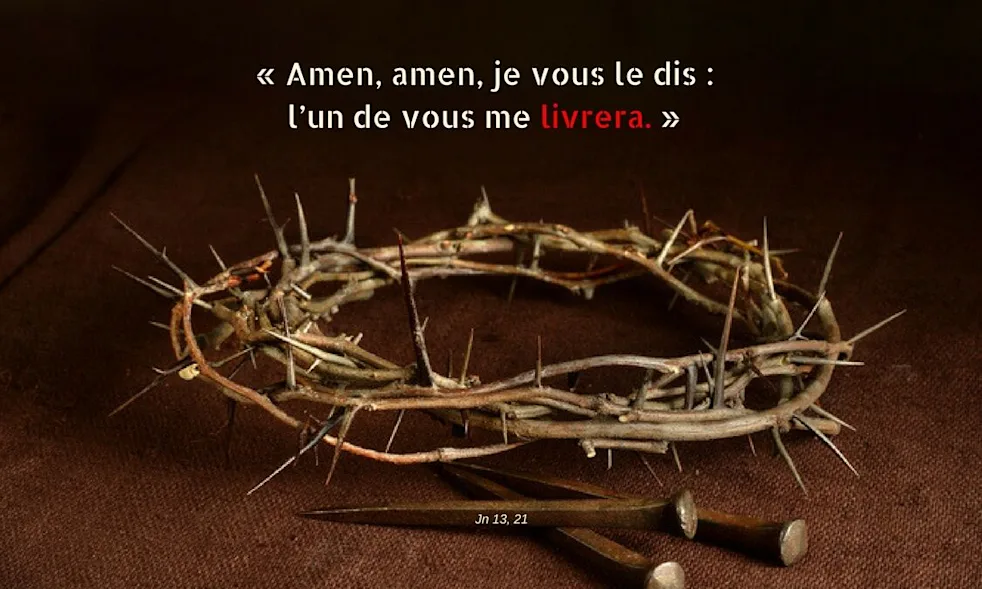 En ce temps-là, au cours du repas que Jésus prenait avec ses disciples, il fut bouleversé en son esprit, et il rendit ce témoignage: «Amen, amen, je vous le dis: l’un de vous me livrera.» Les disciples se regardaient les uns les autres avec embarras, ne sachant pas de qui Jésus parlait. Il y avait à table, appuyé contre Jésus, l’un de ses disciples, celui que Jésus aimait. Simon-Pierre lui fait signe de demander à Jésus de qui il veut parler. Le disciple se penche donc sur la poitrine de Jésus et lui dit: «Seigneur, qui est-ce?» Jésus lui répond: «C’est celui à qui je donnerai la bouchée que je vais tremper dans le plat.» (Jn 13, 21-33.36-38)