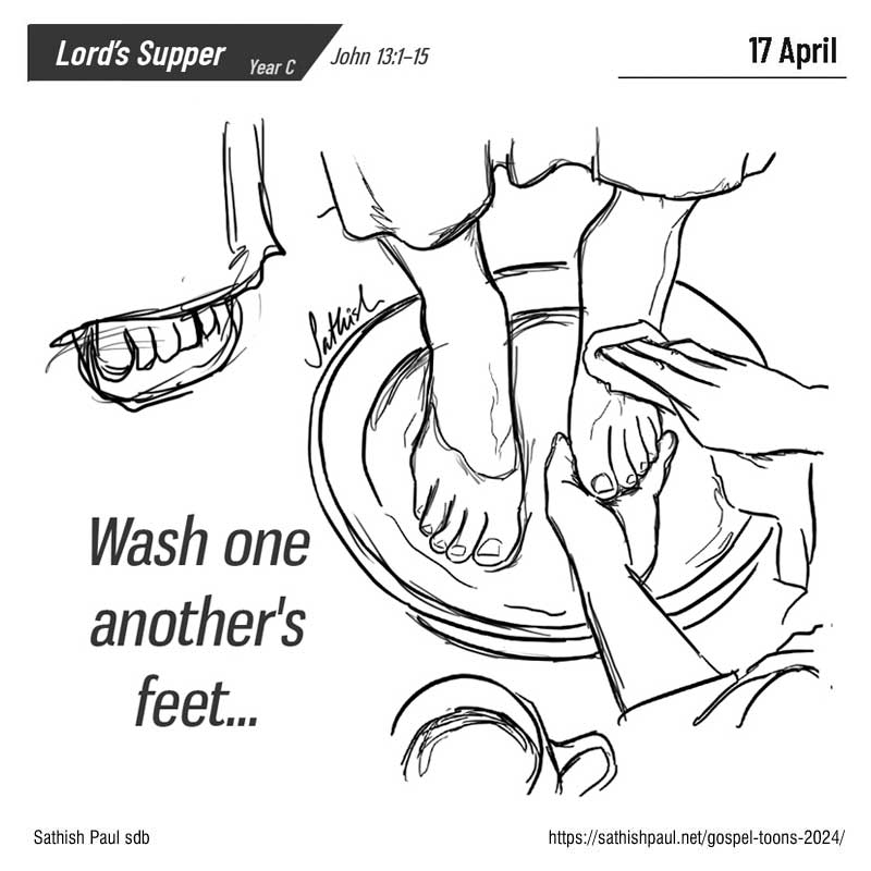Quand il leur eut lavé les pieds, il reprit son vêtement, se remit à table et leur dit: «Comprenez-vous ce que je viens de faire pour vous? Vous m’appelez “Maître” et “Seigneur”, et vous avez raison, car vraiment je le suis. Si donc moi, le Seigneur et le Maître, je vous ai lavé les pieds, vous aussi, vous devez vous laver les pieds les uns aux autres. C’est un exemple que je vous ai donné afin que vous fassiez, vous aussi, comme j’ai fait pour vous. » (Jn 13, 1-15)