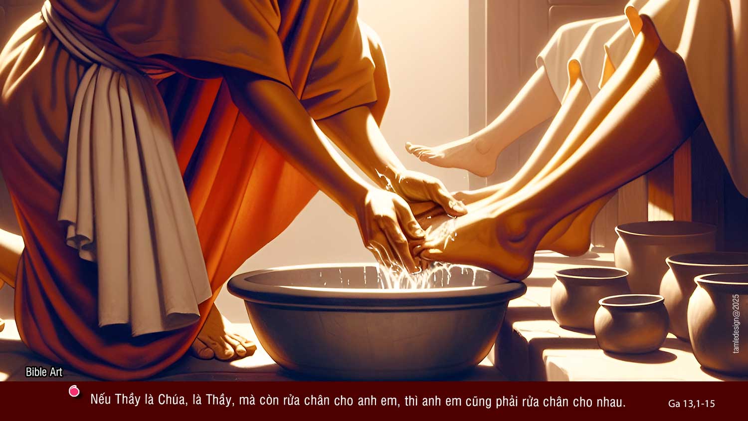 Trước lễ Vượt Qua, Đức Giê-su biết giờ của Người đã đến, giờ phải bỏ thế gian mà về với Chúa Cha. Người vẫn yêu thương những kẻ thuộc về mình còn ở thế gian, và Người yêu thương họ đến cùng. Ma quỷ đã gieo vào lòng Giu-đa, con ông Si-mon Ít-ca-ri-ốt, ý định nộp Đức Giê-su. Đức Giê-su biết rằng: Chúa Cha đã giao phó mọi sự trong tay Người, Người bởi Thiên Chúa mà đến, và sắp trở về cùng Thiên Chúa, nên trong một bữa ăn Người đứng dậy, rời bàn ăn, cởi áo ngoài ra, và lấy khăn mà thắt lưng. Rồi Đức Giê-su đổ nước vào chậu, bắt đầu rửa chân cho các môn đệ và lấy khăn thắt lưng mà lau. Vậy, Người đến chỗ ông Si-mon Phê-rô, ông liền thưa với Người: “Thưa Thầy! Thầy mà lại rửa chân cho con sao?” Đức Giê-su trả lời: “Việc Thầy làm, bây giờ anh chưa hiểu, nhưng sau này anh sẽ hiểu.” Ông Phê-rô lại thưa: “Thầy mà rửa chân cho con, không đời nào con chịu đâu!” Đức Giê-su đáp: “Nếu Thầy không rửa cho anh, anh sẽ chẳng được chung phần với Thầy.” Ông Si-mon Phê-rô liền thưa: “Vậy, thưa Thầy, xin cứ rửa, không những chân, mà cả tay và đầu con nữa.” Đức Giê-su bảo ông: “Ai đã tắm rồi, thì không cần phải rửa nữa; toàn thân người ấy đã sạch. Về phần anh em, anh em đã sạch, nhưng không phải tất cả đâu!” Thật vậy, Người biết ai sẽ nộp Người, nên mới nói: “Không phải tất cả anh em đều sạch.” Khi rửa chân cho các môn đệ xong, Đức Giê-su mặc áo vào, về chỗ và nói: “Anh em có hiểu việc Thầy mới làm cho anh em không? Anh em gọi Thầy là ‘Thầy’, là ‘Chúa’, điều đó phải lắm, vì quả thật, Thầy là Thầy, là Chúa. Vậy, nếu Thầy là Chúa, là Thầy, mà còn rửa chân cho anh em, thì anh em cũng phải rửa chân cho nhau. Thầy đã nêu gương cho anh em, để anh em cũng làm như Thầy đã làm cho anh em. Đó là lời Chúa.