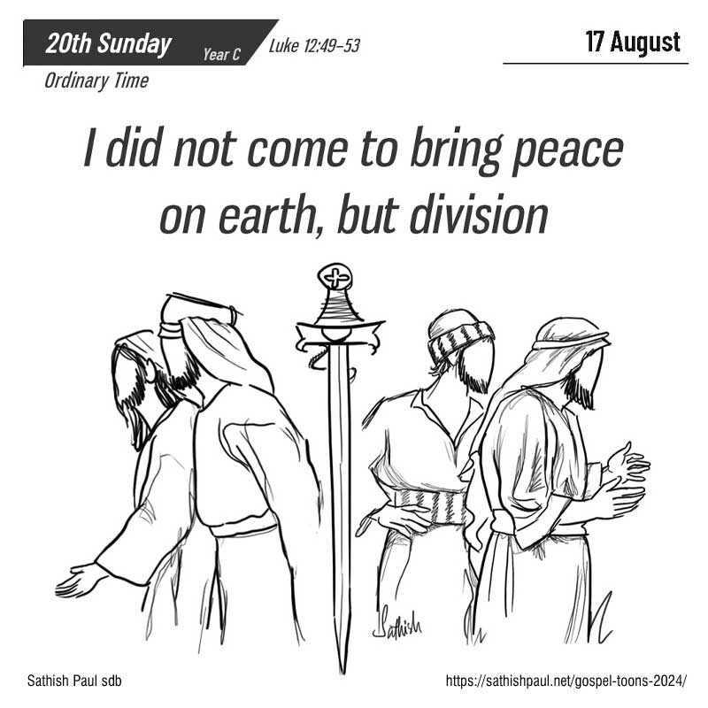 Khi ấy, Đức Giêsu nói với các môn đệ rằng: “Thầy đã đến ném lửa vào mặt đất, và Thầy những ước mong phải chi lửa ấy đã bùng lên! Thầy còn một phép rửa phải chịu, và lòng Thầy khắc khoải biết bao cho đến khi việc này hoàn tất! “Anh em tưởng rằng Thầy đến để ban hoà bình cho trái đất sao? Thầy bảo cho anh em biết: không phải thế đâu, nhưng là đem sự chia rẽ. Vì từ nay, năm người trong cùng một nhà sẽ chia rẽ nhau, ba chống lại hai, hai chống lại ba. Họ sẽ chia rẽ nhau: cha chống lại con trai, con trai chống lại cha; mẹ chống lại con gái, con gái chống lại mẹ; mẹ chồng chống lại nàng dâu, nàng dâu chống lại mẹ chồng.”. Ðó là lời Chúa.
