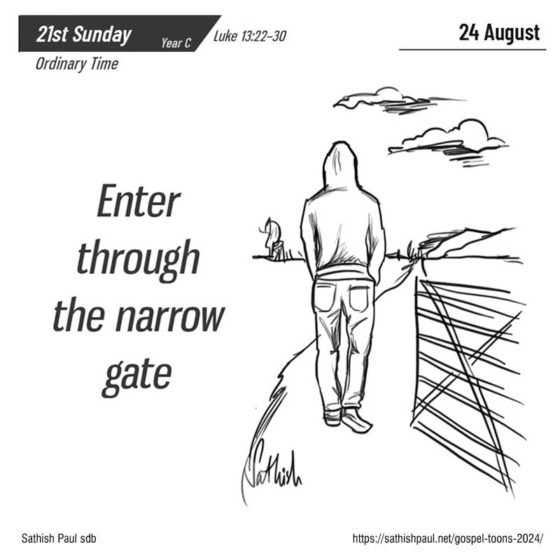Quelqu’un lui demanda : « Seigneur, n’y a-t-il que peu de gens qui soient sauvés ? » Jésus leur dit : « Efforcez-vous d’entrer par la porte étroite, car, je vous le déclare, beaucoup chercheront à entrer et n’y parviendront pas. Lorsque le maître de maison se sera levé pour fermer la porte, si vous, du dehors, vous vous mettez à frapper à la porte, en disant : “Seigneur, ouvre-nous”, il vous répondra : “Je ne sais pas d’où vous êtes.” (Lc 13, 22-30)