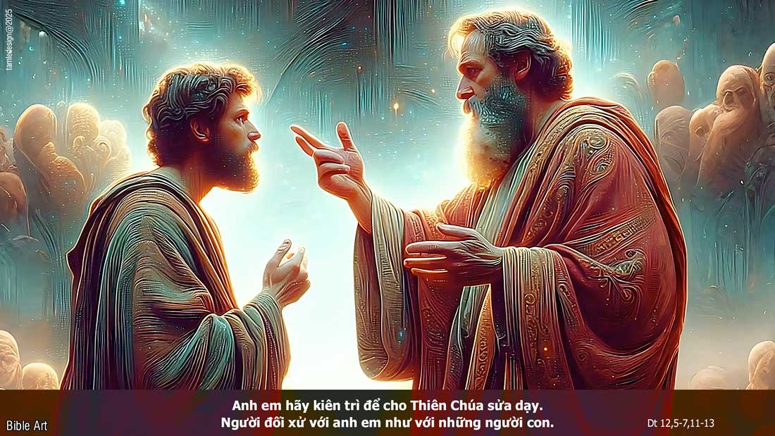 Thưa anh em, anh em đã quên lời khuyên nhủ được nói với anh em như với những người con: Con ơi, đừng coi nhẹ lời Chúa sửa dạy, chớ nản lòng khi Người khiển trách. Vì Chúa thương ai thì mới sửa dạy kẻ ấy, và có nhận ai làm con thì Người mới cho roi cho vọt. Anh em hãy kiên trì để cho Thiên Chúa sửa dạy. Người đối xử với anh em như với những người con. Thật vậy, có đứa con nào mà người cha không sửa dạy? Ngay lúc bị sửa dạy, thì chẳng ai lấy làm vui thú mà chỉ thấy buồn phiền. Nhưng sau đó, những người chịu rèn luyện như thế sẽ gặt được hoa trái là bình an và công chính. Bởi vậy, hãy làm cho những bàn tay bủn rủn, những đầu gối rã rời, nên mạnh mẽ. Hãy sửa đường cho thẳng mà đi, để người què khỏi trật bước và hơn nữa, còn được chữa lành. Ðó là lời Chúa.