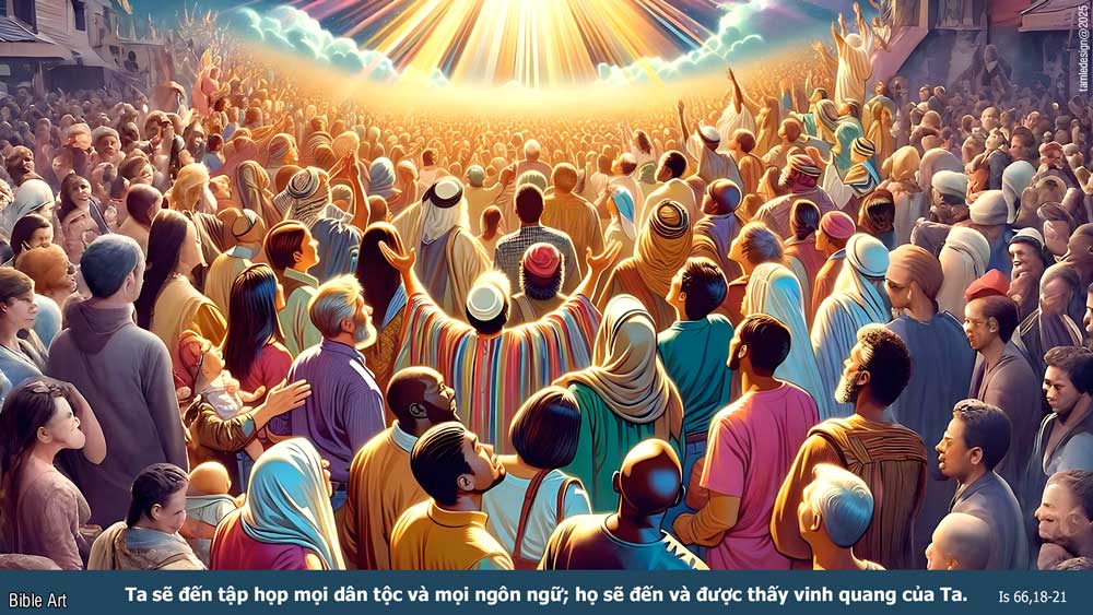 Ðức Chúa phán như sau: Ta biết rõ việc làm và ý định của chúng, Ta sẽ đến tập họp mọi dân tộc và mọi ngôn ngữ; họ sẽ đến và được thấy vinh quang của Ta. Ta sẽ đặt giữa họ một dấu hiệu và sai những kẻ sống sót của họ đến các dân tộc: Tác-sít, Pút, Lút, là những dân thạo nghề cung nỏ, đến dân Tu-van, Gia-van, đến những hải đảo xa xăm chưa hề được nghe nói đến Ta và chưa hề thấy vinh quang của Ta. Họ sẽ loan báo vinh quang của Ta giữa các dân tộc. Đức Chúa phán: giống như con cái Ít-ra-en mang lễ phẩm trên chén dĩa thanh sạch đến Nhà Đức Chúa, người ta cũng sẽ đưa tất cả những anh em các ngươi thuộc mọi dân tộc về làm lễ phẩm tiến dâng Đức Chúa – đưa bằng ngựa, xe, võng cáng, lừa và lạc đà – về trên núi thánh của Ta là Giê-ru-sa-lem. Và cả trong bọn họ, Ta sẽ chọn lấy một số làm tư tế, làm thầy Lê-vi – Đức Chúa phán như vậy. Ðó là lời Chúa.