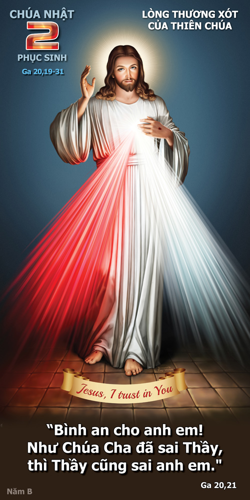 Vào chiều ngày thứ nhất trong tuần, nơi các môn đệ ở, các cửa đều đóng kín, vì các ông sợ người Do-thái. Đức Giê-su đến, đứng giữa các ông và nói: “Bình an cho anh em!” Nói xong, Người cho các ông xem tay và cạnh sườn. Các môn đệ vui mừng vì được thấy Chúa. Người lại nói với các ông: “Bình an cho anh em! Như Chúa Cha đã sai Thầy, thì Thầy cũng sai anh em.” Nói xong, Người thổi hơi vào các ông và bảo: “Anh em hãy nhận lấy Thánh Thần. Anh em tha tội cho ai, thì người ấy được tha; anh em cầm giữ ai, thì người ấy bị cầm giữ.” Một người trong Nhóm Mười Hai, tên là Tô-ma, cũng gọi là Đi-đy-mô, không ở với các ông khi Đức Giê-su đến. Các môn đệ khác nói với ông: “Chúng tôi đã được thấy Chúa!” Ông Tô-ma đáp: “Nếu tôi không thấy dấu đinh ở tay Người, nếu tôi không xỏ ngón tay vào lỗ đinh và không đặt bàn tay vào cạnh sườn Người, tôi chẳng có tin.” Tám ngày sau, các môn đệ Đức Giê-su lại có mặt trong nhà, có cả ông Tô-ma ở đó với các ông. Các cửa đều đóng kín. Đức Giê-su đến, đứng giữa các ông và nói: “Bình an cho anh em!” Rồi Người bảo ông Tô-ma: “Đặt ngón tay vào đây, và hãy nhìn xem tay Thầy. Đưa tay ra mà đặt vào cạnh sườn Thầy. Đừng cứng lòng nữa, nhưng hãy tin.” Ông Tô-ma thưa Người: “Lạy Chúa của con, lạy Thiên Chúa của con!” Đức Giê-su bảo: “Vì đã thấy Thầy, nên anh tin. Phúc thay những người không thấy mà tin!” Đức Giê-su đã làm nhiều dấu lạ khác nữa trước mặt các môn đệ; nhưng những dấu lạ đó không được ghi chép trong sách này. Còn những điều đã được chép ở đây là để anh em tin rằng Đức Giê-su là Đấng Ki-tô, Con Thiên Chúa, và để anh em tin mà được sự sống nhờ danh Người. Đó là lời Chúa.