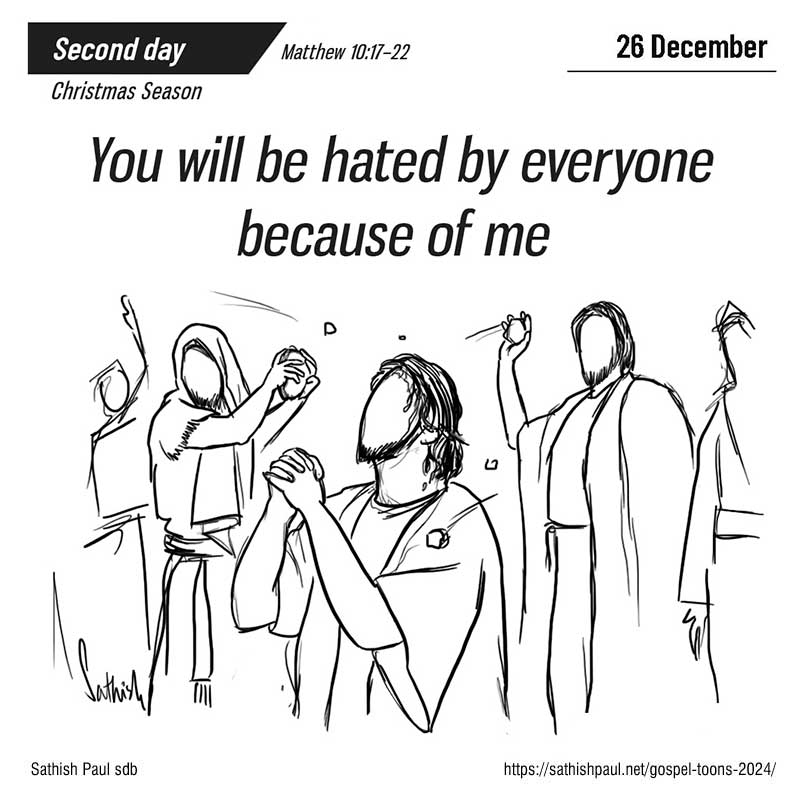 Một hôm, Đức Giê-su nói với các môn đệ rằng: “Hãy coi chừng người đời. Họ sẽ nộp anh em cho các hội đồng, và sẽ đánh đập anh em trong các hội đường của họ. Và anh em sẽ bị điệu ra trước mặt vua chúa quan quyền vì Thầy để làm chứng cho họ và các dân ngoại được biết. Khi người ta nộp anh em, thì anh em đừng lo phải nói làm sao hay phải nói gì, vì trong giờ đó, Thiên Chúa sẽ cho anh em biết phải nói gì: thật vậy, không phải chính anh em nói, mà là Thần Khí của Cha anh em nói trong anh em. “Anh sẽ nộp em, em sẽ nộp anh cho người ta giết; cha sẽ nộp con, con cái sẽ đứng lên chống lại cha mẹ và làm cho cha mẹ phải chết. Vì danh Thầy, anh em sẽ bị mọi người thù ghét. Nhưng kẻ nào bền chí đến cùng, kẻ ấy sẽ được cứu thoát.” Đó là lời Chúa.