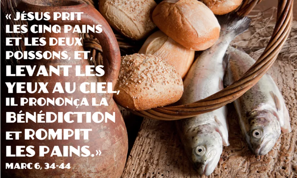 Il leur ordonna de les faire tous asseoir par groupes sur l’herbe verte. Ils se disposèrent par carrés de cent et de cinquante. Jésus prit les cinq pains et les deux poissons, et, levant les yeux au ciel, il prononça la bénédiction et rompit les pains ; il les donnait aux disciples pour qu’ils les distribuent à la foule. (Mc 6, 34-44)