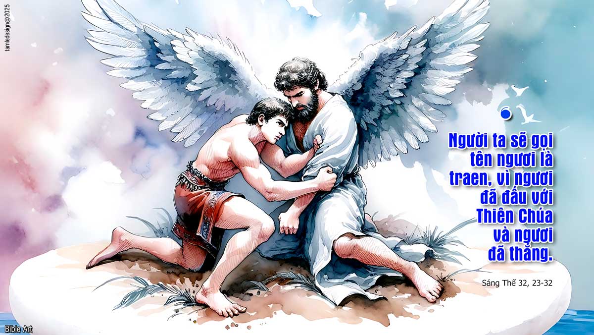 Đêm đó, ông Gia-cóp dậy, đem theo hai bà vợ, hai người nữ tỳ và mười một đứa con, và ông lội qua sông Giáp-bốc. Ông đem họ theo, đưa họ qua sông, rồi đưa tài sản của ông qua. Ông Gia-cóp ở lại một mình. Có một người vật lộn với ông cho đến lúc rạng đông. Thấy không thắng được ông, người đó bèn đánh vào khớp xương hông của ông, và khớp xương hông của Gia-cóp bị trật đang khi ông vật lộn với người đó. Người đó nói: “Buông ta ra, vì đã rạng đông rồi.” Nhưng ông đáp: “Tôi sẽ không buông ngài ra, nếu ngài không chúc phúc cho tôi.” Người đó hỏi ông: “Tên ngươi là gì?” Ông đáp: “Tên tôi là Gia-cóp.” Người đó nói: “Người ta sẽ không gọi tên ngươi là Gia-cóp nữa, nhưng là Ít-ra-en, vì ngươi đã đấu với Thiên Chúa và với người ta, và ngươi đã thắng.” Ông Gia-cóp hỏi: “Xin cho tôi biết tên ngài.” Người đó nói: “Sao ngươi lại hỏi tên ta?” Và người đó chúc phúc cho ông tại đấy. Ông Gia-cóp đặt tên cho nơi đó là Pơ-nu-ên, “vì ông nói tôi đã thấy Thiên Chúa mặt đối mặt, mà tôi đã được tha mạng.” Khi mặt trời mọc, ông đi qua Pơ-nu-ên; ông đi khập khiễng vì bị trật xương hông. Bởi thế, con cái Ít-ra-en, cho đến nay, không ăn cái gân đùi ở khớp xương hông, vì người đó đã đánh vào khớp xương hông của ông Gia-cóp, vào gần đùi. Đó là lời Chúa.
