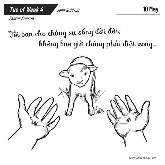 Khi ấy, ở Giê-ru-sa-lem, người ta đang mừng lễ Cung Hiến Đền Thờ. Bấy giờ là mùa đông. Đức Giê-su đi đi lại lại trong Đền Thờ, tại hành lang Sa-lô-mon. Người Do-thái vây quanh Đức Giê-su và nói: “Ông còn để lòng trí chúng tôi phải thắc mắc cho đến bao giờ? Nếu ông là Đấng Ki-tô, thì xin nói công khai cho chúng tôi biết.” Đức Giê-su đáp: “Tôi đã nói với các ông rồi mà các ông không tin. Những việc tôi làm nhân danh Cha tôi, những việc đó làm chứng cho tôi. Nhưng các ông không tin, vì các ông không thuộc về đoàn chiên của tôi. Chiên của tôi thì nghe tiếng tôi; tôi biết chúng và chúng theo tôi. Tôi ban cho chúng sự sống đời đời; không bao giờ chúng phải diệt vong và không ai cướp được chúng khỏi tay tôi. Cha tôi, Đấng đã ban chúng cho tôi, thì lớn hơn tất cả, và không ai cướp được chúng khỏi tay Chúa Cha. Tôi và Chúa Cha là một.” Đó là lời Chúa.