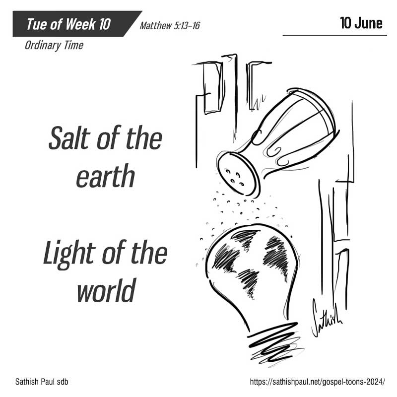 Khi ấy, Đức Giê-su nói với các môn đệ rằng: “Chính anh em là muối cho đời. Nhưng muối mà nhạt đi, thì lấy gì muối nó cho mặn lại? Nó đã thành vô dụng, thì chỉ còn việc quăng ra ngoài cho người ta chà đạp thôi. Chính anh em là ánh sáng cho trần gian. Một thành xây trên núi không tài nào che giấu được. Cũng chẳng có ai thắp đèn lên rồi lại đặt bên dưới cái thùng, nhưng đặt trên đế, và nó soi sáng cho mọi người trong nhà. Cũng vậy, ánh sáng của anh em phải chiếu giãi trước mặt thiên hạ, để họ thấy những công việc tốt đẹp anh em làm, mà tôn vinh Cha của anh em, Đấng ngự trên trời.” Đó là lời Chúa.