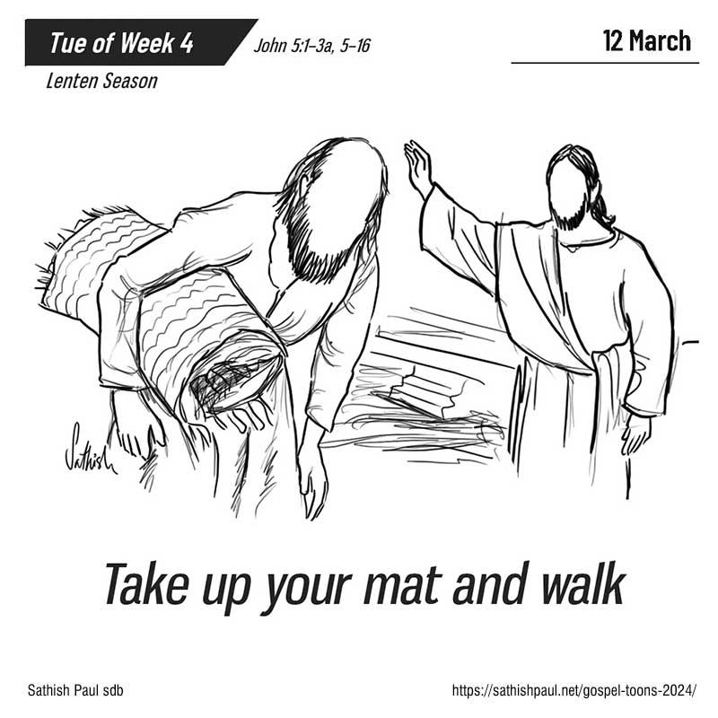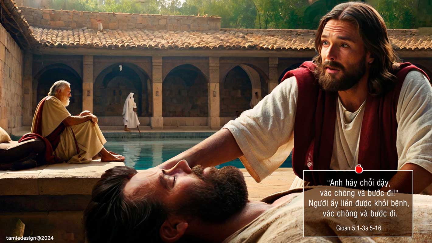 Nhân dịp lễ của người Do-thái, Đức Giê-su lên Giê-ru-sa-lem. Tại Giê-ru-sa-lem, gần Cửa Chiên, có một hồ nước, tiếng Híp-ri gọi là Bết-da-tha. Hồ này có năm hành lang. Nhiều người đau ốm, đui mù, què quặt, bất toại nằm la liệt… Ở đó, có một người đau ốm đã ba mươi tám năm. Đức Giê-su thấy anh ta nằm đấy và biết anh sống trong tình trạng đó đã lâu, thì nói: “Anh có muốn khỏi bệnh không ?” Bệnh nhân đáp: “Thưa Ngài, tôi không có người đem tôi xuống hồ, khi nước khuấy lên. Lúc tôi tới đó, thì đã có người khác xuống trước mất rồi!” Đức Giê-su bảo: “Anh hãy chỗi dậy, vác chõng và bước đi!” Người ấy liền được khỏi bệnh, vác chõng và bước đi. Hôm đó lại là ngày sa-bát. Người Do-thái mới nói với kẻ được khỏi bệnh: “Hôm nay là ngày sa-bát, anh không được phép vác chõng!” Nhưng anh đáp: “Chính người chữa tôi khỏi bệnh đã nói với tôi: ‘Anh hãy vác chõng và đi!’” Họ hỏi anh: “Ai là người đã bảo anh: ‘Vác chõng và đi’?” Nhưng người đã được khỏi bệnh không biết là ai. Quả thế, Đức Giê-su đã lánh đi, vì có đám đông ở đấy. Sau đó, Đức Giê-su gặp người ấy trong Đền Thờ và nói: “Này, anh đã được khỏi bệnh. Đừng phạm tội nữa, kẻo lại phải khốn hơn trước!” Anh ta đi nói với người Do-thái: Đức Giê-su là người đã chữa anh khỏi bệnh. Do đó, người Do-thái chống đối Đức Giê-su, vì Người hay chữa bệnh ngày sa-bát. Đó là lời Chúa.