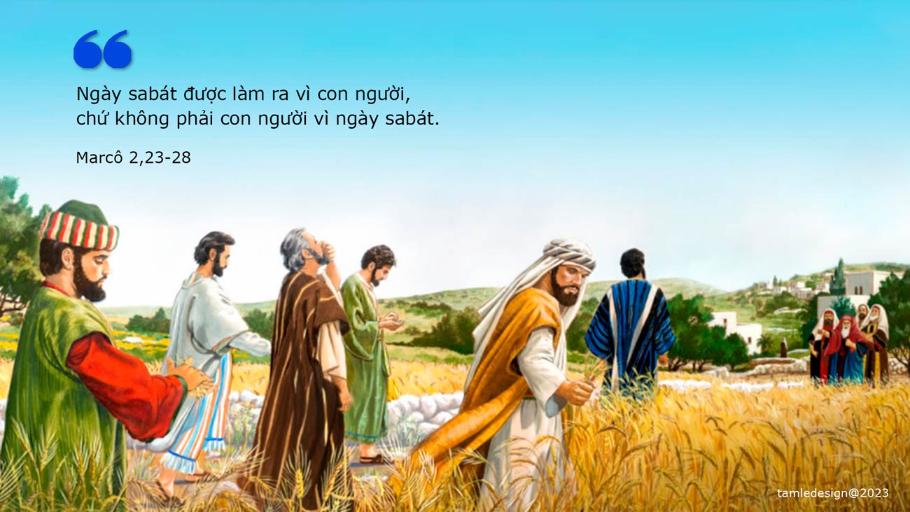 Vào ngày sa-bát, Đức Giê-su đi băng qua một cánh đồng lúa. Các môn đệ Người bắt đầu bứt lúa trong khi đi đường. Những người Pha-ri-sêu liền nói với Đức Giê-su: “Ông coi, ngày sa-bát mà họ làm gì kia? Điều ấy đâu được phép!” Người đáp: “Các ông chưa bao giờ đọc trong Sách à? Vua Đa-vít đã làm gì, khi vua và thuộc hạ bị thiếu thốn và đói bụng? Dưới thời thượng tế A-vi-a-tha, vua vào nhà Thiên Chúa và ăn bánh tiến. Thứ bánh này không ai được phép ăn ngoại trừ tư tế, thế mà vua đã ăn, rồi còn cho cả thuộc hạ ăn nữa.” Người nói tiếp: “Ngày sa-bát được làm ra vì con người, chứ không phải con người vì ngày sa-bát. Bởi đó, Con Người làm chủ luôn cả ngày sa-bát.” Đó là lời Chúa.