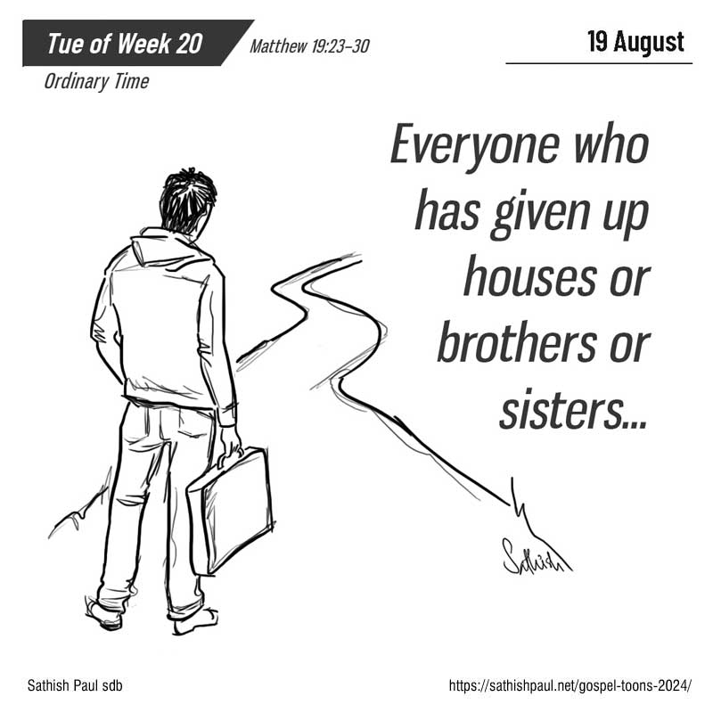 Bấy giờ Đức Giê-su nói với các môn đệ rằng: “Thầy bảo thật anh em, người giàu có khó vào Nước Trời. Thầy còn nói cho anh em biết: con lạc đà chui qua lỗ kim còn dễ hơn người giàu vào Nước Thiên Chúa”. Nghe nói vậy, các môn đệ vô cùng sửng sốt và nói: “Thế thì ai có thể được cứu?” Đức Giê-su nhìn thẳng vào các ông và nói: “Đối với loài người thì điều đó không thể được, nhưng đối với Thiên Chúa, thì mọi sự đều có thể được”. Bấy giờ ông Phê-rô lên tiếng thưa Người: “Thầy coi, phần chúng con, chúng con đã bỏ mọi sự mà theo Thầy. Vậy chúng con sẽ được gì?” Đức Giê-su đáp: “Thầy bảo thật anh em: anh em là những người đã theo Thầy, thì đến thời tái sinh, khi Con Người ngự toà vinh hiển, anh em cũng sẽ được ngự trên mười hai toà mà xét xử mười hai chi tộc Ít-ra-en. Và phàm ai bỏ nhà cửa, anh em, chị em, cha mẹ, con cái hay ruộng đất, vì danh Thầy, thì sẽ được gấp bội và còn được sự sống đời đời làm gia nghiệp. Nhiều kẻ đứng đầu sẽ phải xuống hàng chót, và nhiều kẻ đứng chót sẽ được lên hàng đầu”. Đó là lời Chúa.