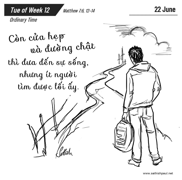 Một hôm, Đức Giê-su nói với các môn đệ rằng: “Của thánh, đừng quăng cho chó; ngọc trai, chớ liệng cho heo, kẻo chúng giày đạp dưới chân, rồi còn quay lại cắn xé anh em. Tất cả những gì anh em muốn người ta làm cho mình, thì chính anh em cũng hãy làm cho người ta, vì Luật Mô-sê và lời các ngôn sứ là thế đó. Hãy qua cửa hẹp mà vào, vì cửa rộng và đường thênh thang thì đưa đến diệt vong, mà nhiều người lại đi qua đó. Còn cửa hẹp và đường chật thì đưa đến sự sống, nhưng ít người tìm được lối ấy.” Đó là lời Chúa.
