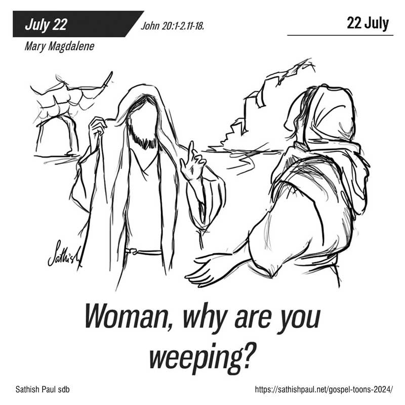 Sáng sớm ngày thứ nhất trong tuần, lúc trời còn tối, bà Ma-ri-a Mác-đa-la đi đến mộ, thì thấy tảng đá đã lăn khỏi mộ. Bà liền chạy về gặp ông Si-mon Phê-rô và người môn đệ Đức Giê-su thương mến. Bà nói: “Người ta đã đem Chúa đi khỏi mộ; và chúng tôi chẳng biết họ để Người ở đâu?”… Bà Ma-ri-a đứng ở ngoài, gần bên mộ, mà khóc. Bà vừa khóc vừa cúi xuống nhìn vào trong mộ, thì thấy hai thiên thần mặc áo trắng ngồi ở nơi đã đặt thi hài của Đức Giê-su, một vị ở phía đầu, một vị ở phía chân. Thiên thần hỏi bà: “Này bà, sao bà khóc?” Bà thưa: “Người ta đã lấy mất Chúa tôi rồi, và tôi không biết họ để Người ở đâu!” Nói xong, bà quay lại và thấy Đức Giê-su đứng đó, nhưng bà không biết là Đức Giê-su. Đức Giê-su nói với bà: “Này bà, sao bà khóc? Bà tìm ai?” Bà Ma-ri-a tưởng là người làm vườn, liền nói: “Thưa ông, nếu ông đã đem Người đi, thì xin nói cho tôi biết ông để Người ở đâu, tôi sẽ đem Người về.” Đức Giê-su gọi bà: “Ma-ri-a!” Bà quay lại và nói bằng tiếng Híp-ri: “Ráp-bu-ni!” (nghĩa là ‘Lạy Thầy’). Đức Giê-su bảo: “Thôi, đừng giữ Thầy lại, vì Thầy chưa lên cùng Chúa Cha. Nhưng hãy đi gặp anh em Thầy và bảo họ: ‘Thầy lên cùng Cha của Thầy, cũng là Cha của anh em, lên cùng Thiên Chúa của Thầy, cũng là Thiên Chúa của anh em’”. Bà Ma-ri-a Mác-đa-la đi báo cho các môn đệ: “Tôi đã thấy Chúa” và bà kể lại những điều Người đã nói với bà. Đó là lời Chúa.
