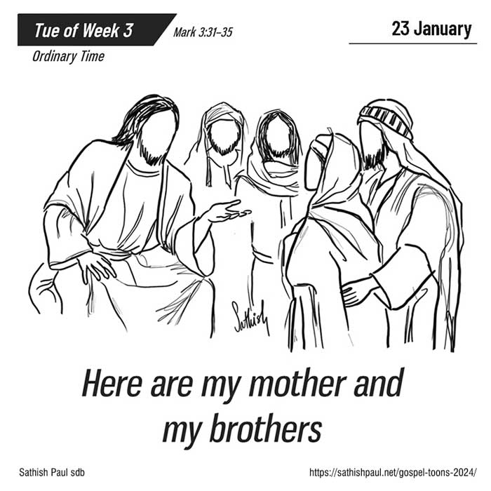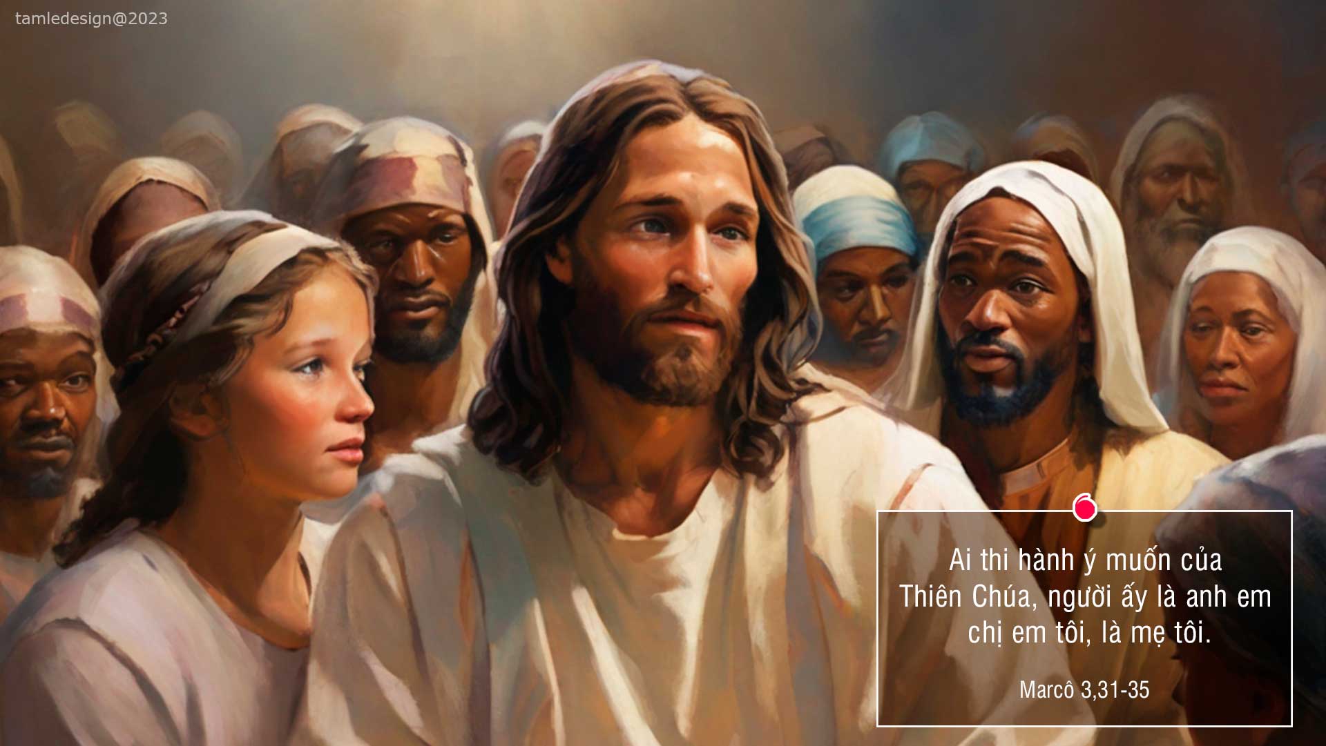 Một hôm, mẹ và anh em Đức Giê-su đến, đứng ở ngoài, cho mời Người ra. Lúc ấy, đám đông đang ngồi chung quanh Người. Có kẻ nói với Người rằng: “Thưa Thầy, có mẹ và anh em chị em Thầy ở ngoài kia đang tìm Thầy!” Nhưng Người đáp lại: “Ai là mẹ tôi? Ai là anh em tôi?” Rồi Người rảo mắt nhìn những kẻ ngồi chung quanh và nói: “Đây là mẹ tôi, đây là anh em tôi. Ai thi hành ý muốn của Thiên Chúa, người ấy là anh em chị em tôi, là mẹ tôi.” Đó là lời Chúa.