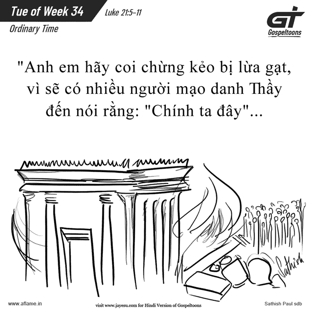 Khi ấy, nhân có mấy người nói về Đền Thờ được trang hoàng bằng những viên đá đẹp và những đồ dâng cúng, Đức Giê-su bảo: “Những gì anh em đang chiêm ngưỡng đó sẽ có ngày bị tàn phá hết, không còn tảng đá nào trên tảng đá nào.” Họ hỏi Người: “Thưa Thầy, vậy bao giờ các sự việc đó sẽ xảy ra, và khi sắp xảy ra, thì có điềm gì báo trước?” Đức Giê-su đáp: “Anh em hãy coi chừng kẻo bị lừa gạt, vì sẽ có nhiều người mạo danh Thầy đến nói rằng: “Chính ta đây”, và: “Thời kỳ đã đến gần”; anh em chớ có theo họ. Khi anh em nghe có chiến tranh, loạn lạc, thì đừng sợ hãi. Vì những việc đó phải xảy ra trước, nhưng chưa phải là chung cục ngay đâu”. Rồi Người nói tiếp: “Dân này sẽ nổi dậy chống dân kia, nước này chống nước nọ. Sẽ có những trận động đất lớn, và nhiều nơi sẽ có ôn dịch và đói kém; sẽ có những hiện tượng kinh khủng và điềm lạ lớn lao từ trời xuất hiện. Đó là lời Chúa.