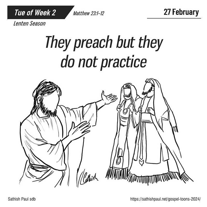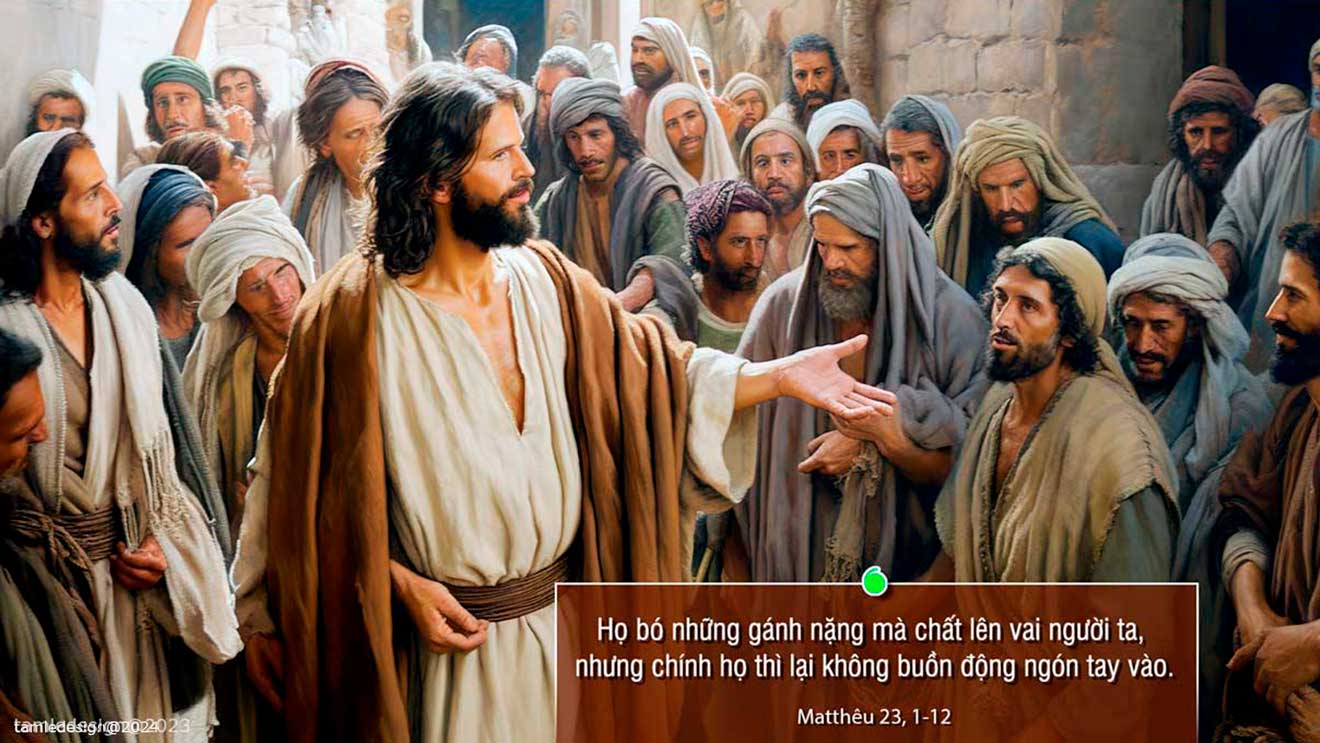 Bấy giờ, Đức Giê-su nói với đám đông và các môn đệ Người rằng: “Các kinh sư và các người Pha-ri-sêu ngồi trên toà ông Mô-sê mà giảng dạy. Vậy, những gì họ nói thì anh em hãy làm, hãy giữ; nhưng đừng theo hành động của họ mà làm, vì họ nói mà không làm. Họ bó những gánh nặng mà chất lên vai người ta, nhưng chính họ thì lại không buồn động ngón tay vào. Họ làm mọi việc cốt để cho thiên hạ thấy. Quả vậy, họ đeo những hộp kinh thật lớn, mang những tua áo thật dài. Họ ưa ngồi cỗ nhất trong đám tiệc, chiếm hàng ghế đầu trong hội đường, ưa được người ta chào hỏi ở những nơi công cộng và được thiên hạ gọi là “ráp-bi”. “Phần anh em, thì đừng để ai gọi mình là “ráp-bi”, vì anh em chỉ có một Thầy; còn tất cả anh em đều là anh em với nhau. Anh em cũng đừng gọi ai dưới đất này là cha của anh em, vì anh em chỉ có một Cha là Cha trên trời. Anh em cũng đừng để ai gọi mình là người lãnh đạo, vì anh em chỉ có một vị lãnh đạo, là Đức Ki-tô. Trong anh em, người làm lớn hơn cả, phải làm người phục vụ anh em. Ai tôn mình lên, sẽ bị hạ xuống; còn ai hạ mình xuống, sẽ được tôn lên. Đó là lời Chúa.