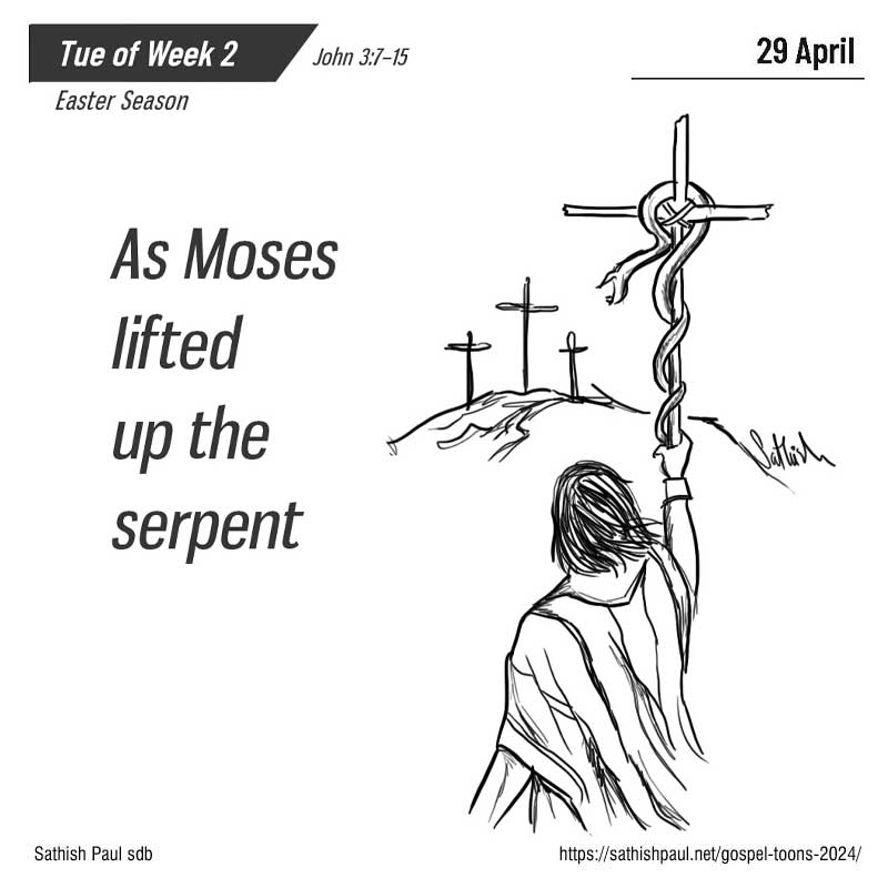 Khi ấy, Đức Giê-su nói với ông Ni-cô-đê-mô rằng: “Các ông cần phải được sinh ra một lần nữa bởi ơn trên. Gió muốn thổi đâu thì thổi; ông nghe tiếng gió, nhưng không biết gió từ đâu đến và thổi đi đâu. Ai bởi Thần Khí mà sinh ra thì cũng vậy.” Ông Ni-cô-đê-mô hỏi Người: “Làm sao những chuyện ấy có thể xảy ra được?” Đức Giê-su đáp: “Ông là bậc thầy trong dân Ít-ra-en, mà lại không biết những chuyện ấy! Thật, tôi bảo thật ông: chúng tôi nói những điều chúng tôi biết, chúng tôi làm chứng về những điều chúng tôi đã thấy, nhưng các ông không nhận lời chứng của chúng tôi. Nếu tôi nói với các ông về những chuyện dưới đất mà các ông còn không tin, thì giả như tôi nói với các ông về những chuyện trên trời, làm sao các ông tin được?” Không ai đã lên trời, ngoại trừ Con Người, Đấng từ trời xuống. Như ông Mô-sê đã giương cao con rắn trong sa mạc, Con Người cũng sẽ phải được giương cao như vậy, để ai tin vào Người thì được sống muôn đời. Đó là lời Chúa.