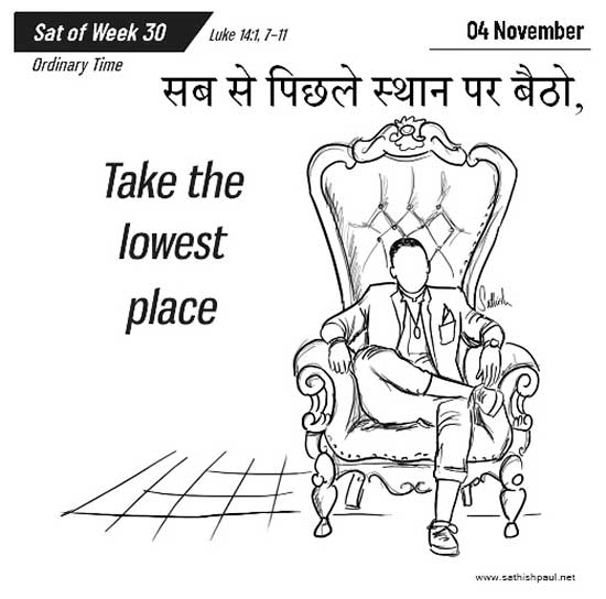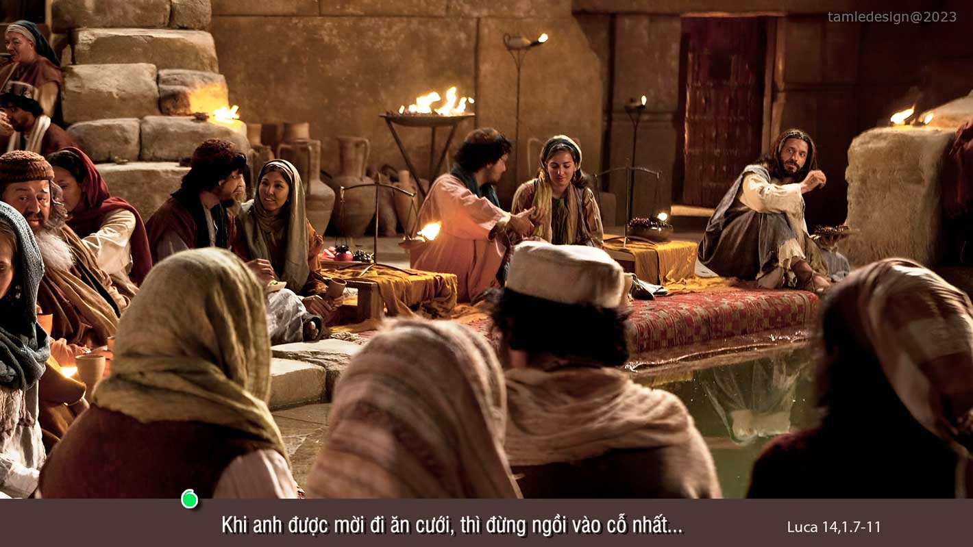 Một ngày sa-bát kia, Đức Giê-su đến nhà một ông thủ lãnh nhóm Pha-ri-sêu để dùng bữa: họ cố dò xét Người. Người nhận thấy khách dự tiệc cứ chọn cỗ nhất mà ngồi, nên nói với họ dụ ngôn này: “Khi anh được mời đi ăn cưới, thì đừng ngồi vào cỗ nhất, kẻo lỡ có nhân vật nào quan trọng hơn anh cũng được mời, và rồi người đã mời cả anh lẫn nhân vật kia phải đến nói với anh rằng: “Xin ông nhường chỗ cho vị này”. Bấy giờ anh sẽ phải xấu hổ mà xuống ngồi chỗ cuối. Trái lại, khi anh được mời, thì hãy vào ngồi chỗ cuối, để cho người đã mời anh phải đến nói: “Xin mời ông bạn lên trên cho”. Thế là anh sẽ được vinh dự trước mặt mọi người đồng bàn”. Vì phàm ai tôn mình lên sẽ bị hạ xuống; còn ai hạ mình xuống sẽ được tôn lên”. Đó là lời Chúa.