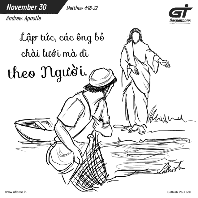 Đang đi dọc theo biển hồ Ga-li-lê, Chúa Giê-su thấy hai anh em kia là Phê-rô và An-rê. Người gọi họ và bảo: “Các anh hãy theo tôi, tôi sẽ làm cho các anh thành những kẻ lưới người như lưới cá.”