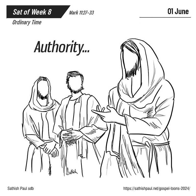 Khi ấy, Đức Giê-su và các môn đệ lại vào Giê-ru-sa-lem. Đang khi Người đi đi lại lại trong Đền Thờ, thì các thượng tế, kinh sư và kỳ mục đến cùng Người và hỏi: “Ông lấy quyền nào mà làm các điều ấy? hay ai đã cho ông quyền đó để ông làm các điều ấy?” Đức Giê-su đáp: “Tôi chỉ xin hỏi các ông một điều thôi. Các ông trả lời đi, rồi tôi sẽ nói cho các ông biết tôi lấy quyền nào mà làm các điều ấy. Vậy, phép rửa của ông Gio-an là do Trời hay do người ta? Các ông trả lời cho tôi đi!” Họ bàn với nhau: “Nếu mình nói: ‘Do Trời’, thì ông ấy sẽ vặn lại: ‘Thế sao các ông lại không tin ông ấy?’ Nhưng chẳng lẽ mình nói: ‘Do người ta’?” Họ sợ dân chúng, vì ai nấy đều cho ông Gio-an thật là một ngôn sứ. Họ mới trả lời Đức Giê-su: “Chúng tôi không biết.” Đức Giê-su liền bảo họ: “Tôi cũng vậy, tôi cũng không nói cho các ông là tôi lấy quyền nào mà làm các điều ấy.” Đó là lời Chúa.