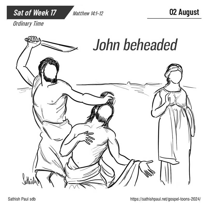 Vua Hêrôđê sai người vào ngục chặt đầu ông Gioan. Môn đệ ông đi báo tin cho Đức Giêsu