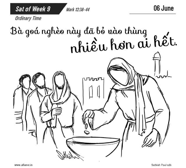 Khi ấy, trong lúc giảng dạy, Đức Giê-su nói rằng: “Anh em phải coi chừng những ông kinh sư ưa dạo quanh, xúng xính trong bộ áo thụng, thích được người ta chào hỏi ở những nơi công cộng. Họ ưa chiếm ghế danh dự trong hội đường, thích ngồi cỗ nhất trong đám tiệc. Họ nuốt hết tài sản của các bà goá, lại còn làm bộ đọc kinh cầu nguyện lâu giờ. Những người ấy sẽ bị kết án nghiêm khắc hơn.” Đức Giê-su ngồi đối diện với thùng tiền dâng cúng cho Đền Thờ. Người quan sát xem đám đông bỏ tiền vào đó ra sao. Có lắm người giàu bỏ thật nhiều tiền. Cũng có một bà goá nghèo đến bỏ vào đó hai đồng tiền kẽm, trị giá một phần tư đồng bạc Rô-ma. Đức Giê-su liền gọi các môn đệ lại và nói: “Thầy bảo thật anh em: bà goá nghèo này đã bỏ vào thùng nhiều hơn ai hết. Quả vậy, mọi người đều lấy tiền dư bạc thừa của họ mà đem bỏ vào đó; còn bà này, thì đã túng thiếu, lại còn bỏ vào đó tất những gì bà có, tất cả những gì để nuôi thân”. Đó là lời Chúa.