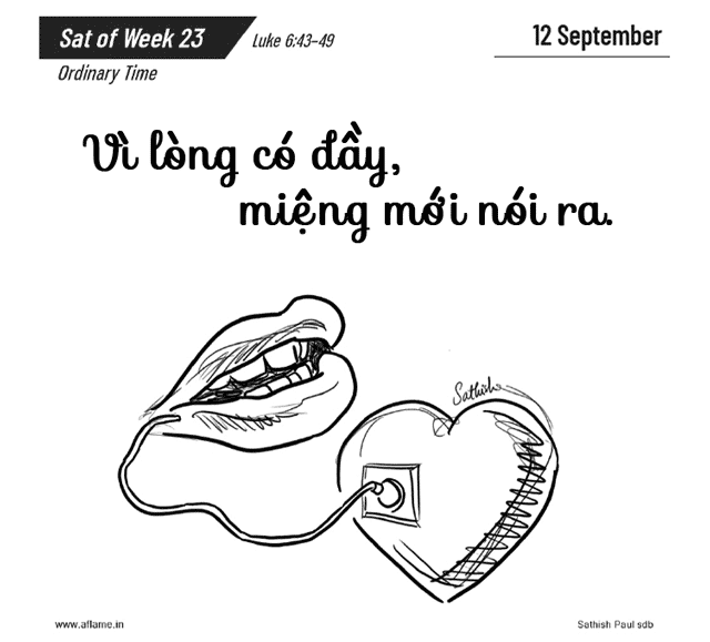 Khi ấy, Đức Giê-su nói với các môn đệ rằng: “Không có cây nào tốt mà lại sinh quả sâu, cũng chẳng có cây nào sâu mà lại sinh quả tốt. Thật vậy, xem quả thì biết cây. Ở bụi gai, làm sao bẻ được vả, trong bụi rậm, làm gì hái được nho. Người tốt thì lấy ra cái tốt từ kho tàng tốt của lòng mình; kẻ xấu thì lấy ra cái xấu từ kho tàng xấu. Vì lòng có đầy, miệng mới nói ra. Tại sao anh em gọi Thầy: “Lạy Chúa! Lạy Chúa!”, mà anh em không làm điều Thầy dạy? Ai đến với Thầy, và nghe những lời Thầy dạy mà đem ra thực hành, thì Thầy sẽ chỉ cho anh em biết người ấy ví được như ai. Người ấy ví được như một người khi xây nhà, đã cuốc, đã đào sâu và đặt nền móng trên đá. Nước lụt dâng lên, dòng sông có ùa vào nhà, thì cũng không lay chuyển nổi, vì nhà đã xây vững chắc. Còn ai nghe mà không thực hành, thì ví được như người xây nhà ngay mặt đất, không nền móng. Nước sông ùa vào, nhà sụp đổ ngay và bị phá huỷ tan tành. Đó là lời Chúa.