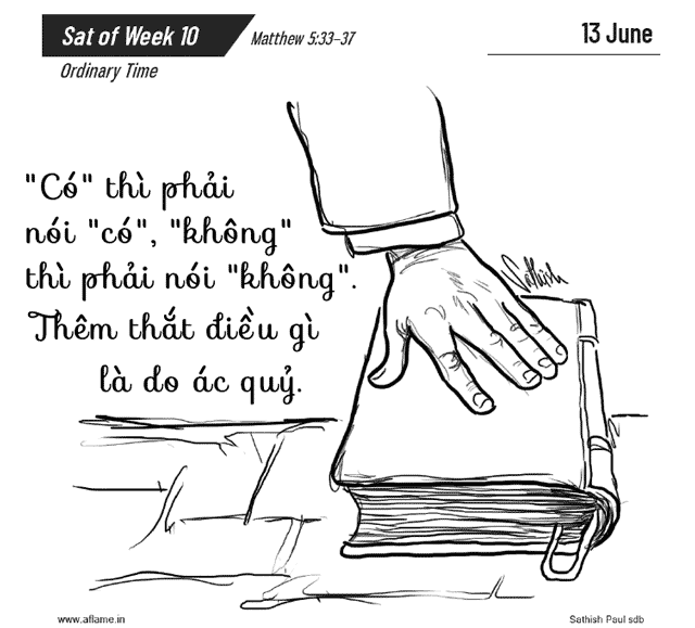 Một hôm, Đức Giê-su nói với các môn đệ rằng: “Anh em đã nghe Luật dạy người xưa rằng: Chớ bội thề, nhưng hãy trọn lời thề với Đức Chúa. Còn Thầy, Thầy bảo cho anh em biết: đừng thề chi cả. Đừng chỉ trời mà thề, vì trời là ngai Thiên Chúa. Đừng chỉ đất mà thề, vì đất là bệ dưới chân Người. Đừng chỉ Giê-ru-sa-lem mà thề, vì đó là thành của Đức Vua cao cả. Đừng chỉ lên đầu mà thề, vì anh không thể làm cho một sợi tóc hoá trắng hay đen được. Nhưng hễ “có” thì phải nói “có”, “không” thì phải nói “không”. Thêm thắt điều gì là do ác quỷ. Đó là lời Chúa.