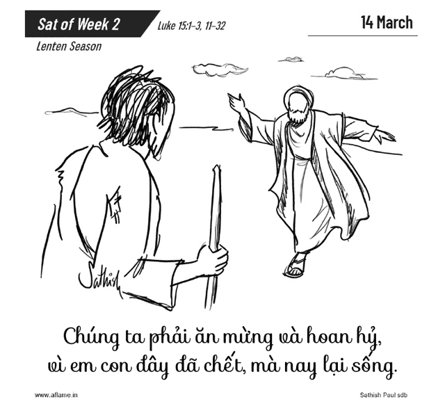 Khi ấy, tất cả những người thu thuế và những người tội lỗi thường đến gần Đức Giê-su mà nghe Người. Còn những người thuộc phái Pha-ri-sêu và các kinh sư thì lẩm bẩm: “Ông này đón tiếp phường tội lỗi và ăn uống với chúng”. Đức Giê-su mới kể cho họ dụ ngôn này: … “Một người kia có hai con trai. Người con thứ nói với cha rằng: “Thưa cha, xin cho con phần tài sản con được hưởng”. Và người cha đã chia của cải cho hai con. Ít ngày sau, người con thứ thu góp tất cả rồi trẩy đi phương xa. Ở đó anh ta sống phóng đãng, phung phí tài sản của mình. Khi anh ta đã ăn tiêu hết sạch, thì lại xảy ra trong vùng ấy một nạn đói khủng khiếp. Và anh ta bắt đầu lâm cảnh túng thiếu, nên phải đi ở cho một người dân trong vùng; người này sai anh ta ra đồng chăn heo. Anh ta ao ước lấy đậu muồng heo ăn mà nhét cho đầy bụng, nhưng chẳng ai cho. Bấy giờ anh ta hồi tâm và tự nhủ: “Biết bao nhiêu người làm công cho cha ta được cơm dư gạo thừa, mà ta ở đây lại chết đói! Thôi, ta đứng lên, đi về cùng cha và thưa với người: “Thưa cha, con thật đắc tội với Trời và với cha, chẳng còn đáng gọi là con cha nữa. Xin coi con như một người làm công cho cha vậy”. Thế rồi anh ta đứng lên đi về cùng cha. “Anh ta còn ở đằng xa, thì người cha đã trông thấy. Ông chạnh lòng thương, chạy ra ôm cổ anh ta và hôn lấy hôn để. Bấy giờ người con nói rằng: “Thưa cha, con thật đắc tội với Trời và với cha, chẳng còn đáng gọi là con cha nữa. Nhưng người cha liền bảo các đầy tớ rằng: “Mau đem áo đẹp nhất ra đây mặc cho cậu, xỏ nhẫn vào ngón tay, xỏ dép vào chân cậu, rồi đi bắt con bê đã vỗ béo làm thịt để chúng ta mở tiệc ăn mừng! Vì con ta đây đã chết mà nay sống lại, đã mất mà nay lại tìm thấy”. Và họ bắt đầu ăn mừng. Lúc ấy người con cả của ông đang ở ngoài đồng. Khi anh ta về gần đến nhà, nghe thấy tiếng đàn ca nhảy múa, liền gọi một người đầy tớ ra mà hỏi xem có chuyện gì. Người ấy trả lời: “Em cậu đã về, và cha cậu đã làm thịt con bê béo, vì được lại cậu ấy mạnh khoẻ”. Người anh cả liền nổi giận và không chịu vào nhà. Nhưng cha cậu ra năn nỉ. Cậu trả lời cha: “Cha coi, đã bao nhiêu năm trời con hầu hạ cha, và chẳng khi nào trái lệnh, thế mà chưa bao giờ cha cho lấy được một con dê con để con ăn mừng với bạn bè. Còn thằng con của cha đó, sau khi đã nuốt hết của cải của cha với bọn điếm, nay trở về, thì cha lại giết bê béo ăn mừng!” Nhưng người cha nói với anh ta: “Con à, lúc nào con cũng ở với cha, tất cả những gì của cha đều là của con. Nhưng chúng ta phải ăn mừng và hoan hỷ, vì em con đây đã chết, mà nay lại sống, đã mất, mà nay lại tìm thấy”. Đó là lời Chúa.
