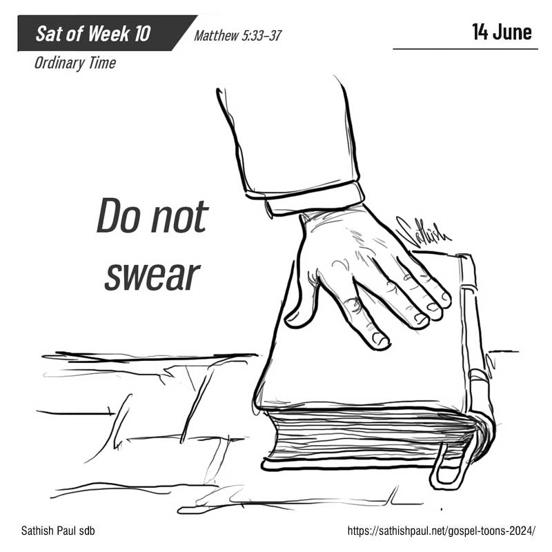 Một hôm, Đức Giê-su nói với các môn đệ rằng: “Anh em đã nghe Luật dạy người xưa rằng: Chớ bội thề, nhưng hãy trọn lời thề với Đức Chúa. Còn Thầy, Thầy bảo cho anh em biết: đừng thề chi cả. Đừng chỉ trời mà thề, vì trời là ngai Thiên Chúa. Đừng chỉ đất mà thề, vì đất là bệ dưới chân Người. Đừng chỉ Giê-ru-sa-lem mà thề, vì đó là thành của Đức Vua cao cả. Đừng chỉ lên đầu mà thề, vì anh không thể làm cho một sợi tóc hoá trắng hay đen được. Nhưng hễ “có” thì phải nói “có”, “không” thì phải nói “không”. Thêm thắt điều gì là do ác quỷ. Đó là lời Chúa.