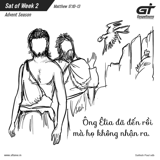 Đang khi thầy trò từ trên núi xuống, các môn đệ hỏi Đức Giê-su rằng: “Sao các kinh sư lại nói Ê-li-a phải đến trước?” Người đáp: “Đúng thế, ông Ê-li-a phải đến để chỉnh đốn mọi sự. Nhưng Thầy nói cho anh em biết: ông Ê-li-a đã đến rồi mà họ không nhận ra, lại còn xử với ông theo ý họ muốn. Con Người cũng sẽ phải đau khổ vì họ như thế.” Bấy giờ các môn đệ hiểu Người có ý nói về ông Gio-an Tẩy Giả. Đó là lời Chúa.